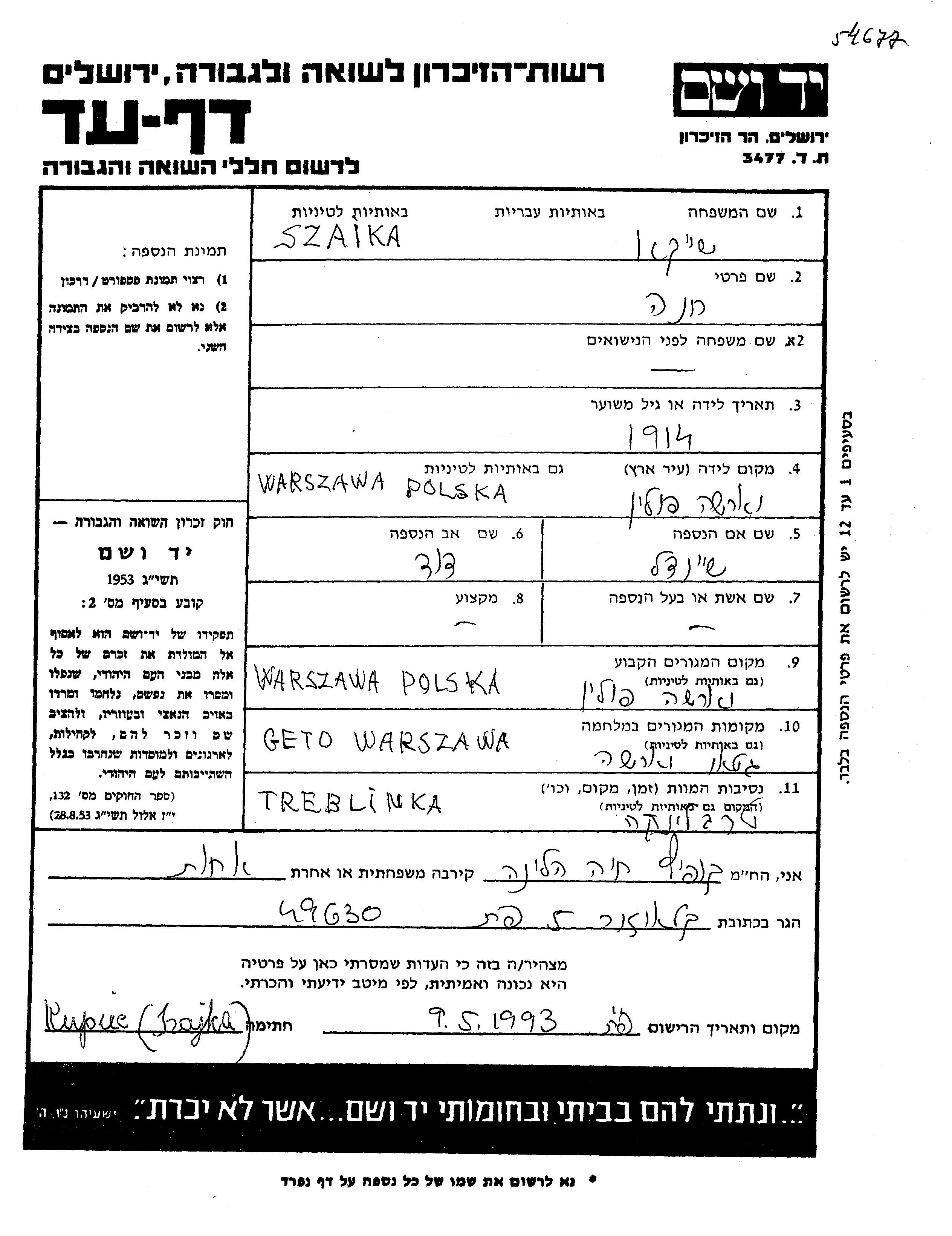 Chana Szaika wurde im Jahr 1914 in Warszawa, Polen geboren. Sie war die Tochter von David und Sheindl, geb. Mondash. Vor dem Zweiten Weltkrieg lebte sie in Warszawa, Polen. Während des Krieges war sie in Warszawa, Polen.