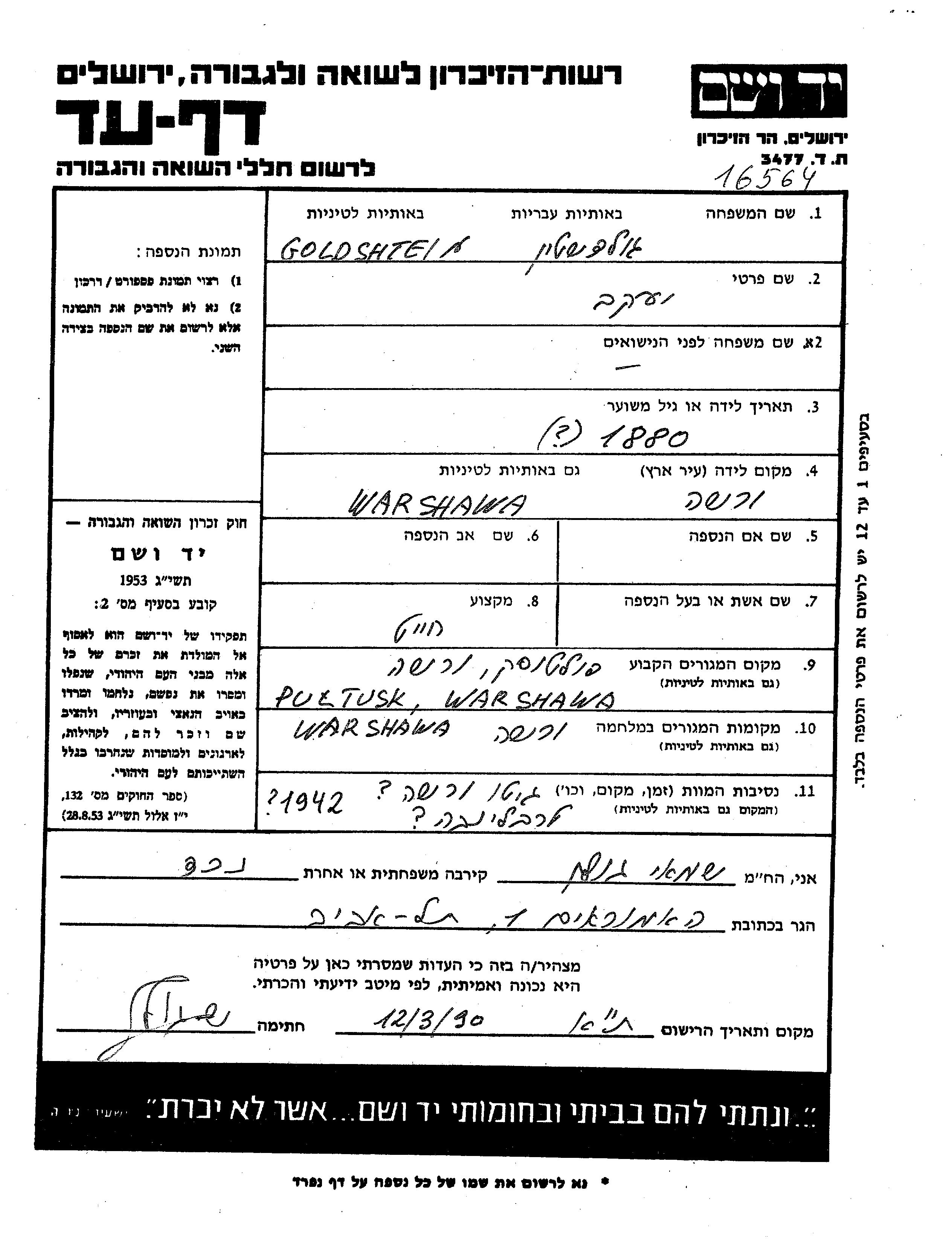 Yakov Goldshtein wurde im Jahr 1880 in Warszawa, Polen geboren. Er war Schneider und mit Feiga Lea Verheiratet. Vor dem Zweiten Weltkrieg lebte er in Pultusk, Polen. Während des Krieges war er in Warszawa, Polen.