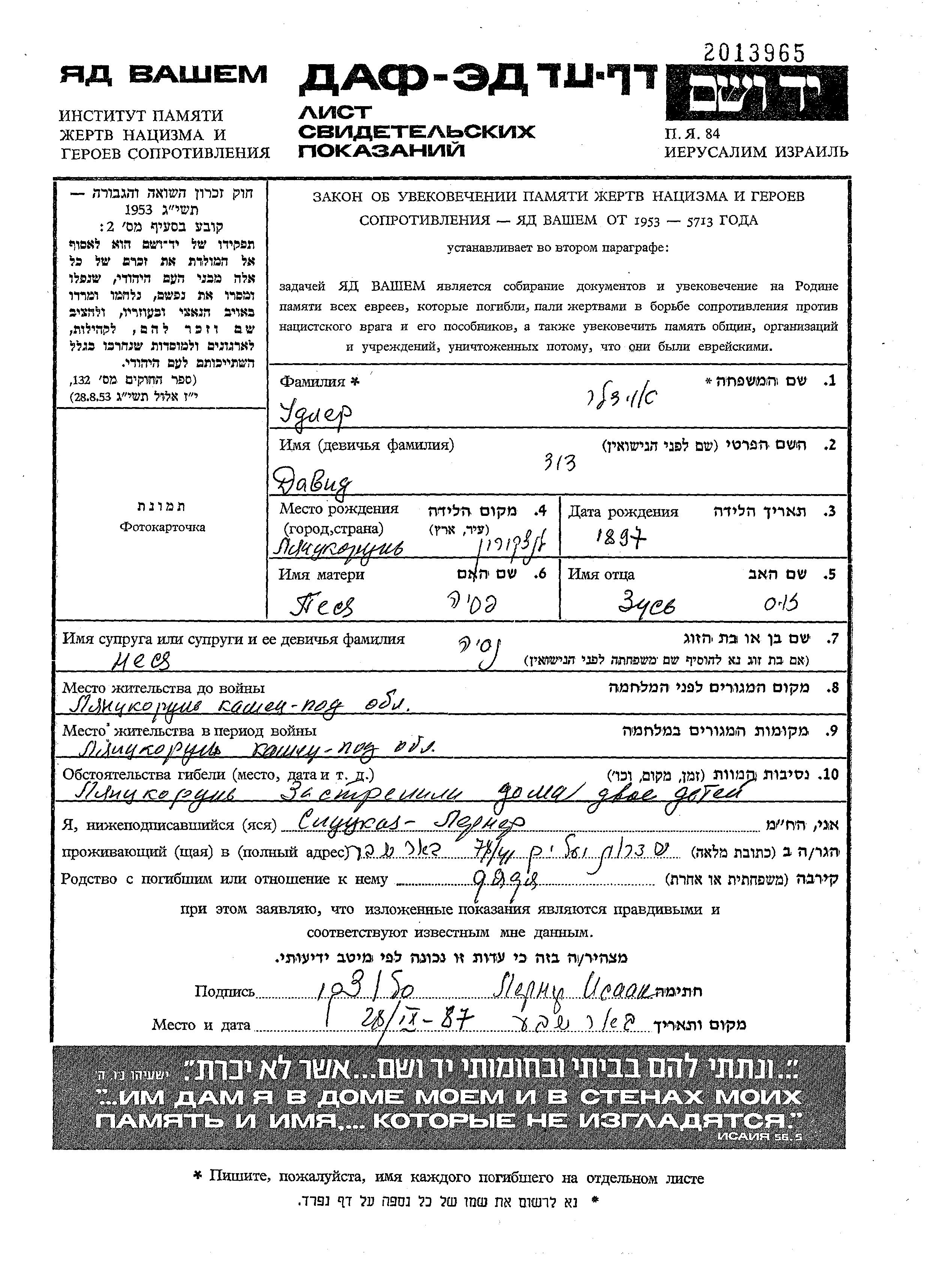 David wurde in der Schoah ermordet. Todesort: Laskorun, Ukraine (UdSSR).