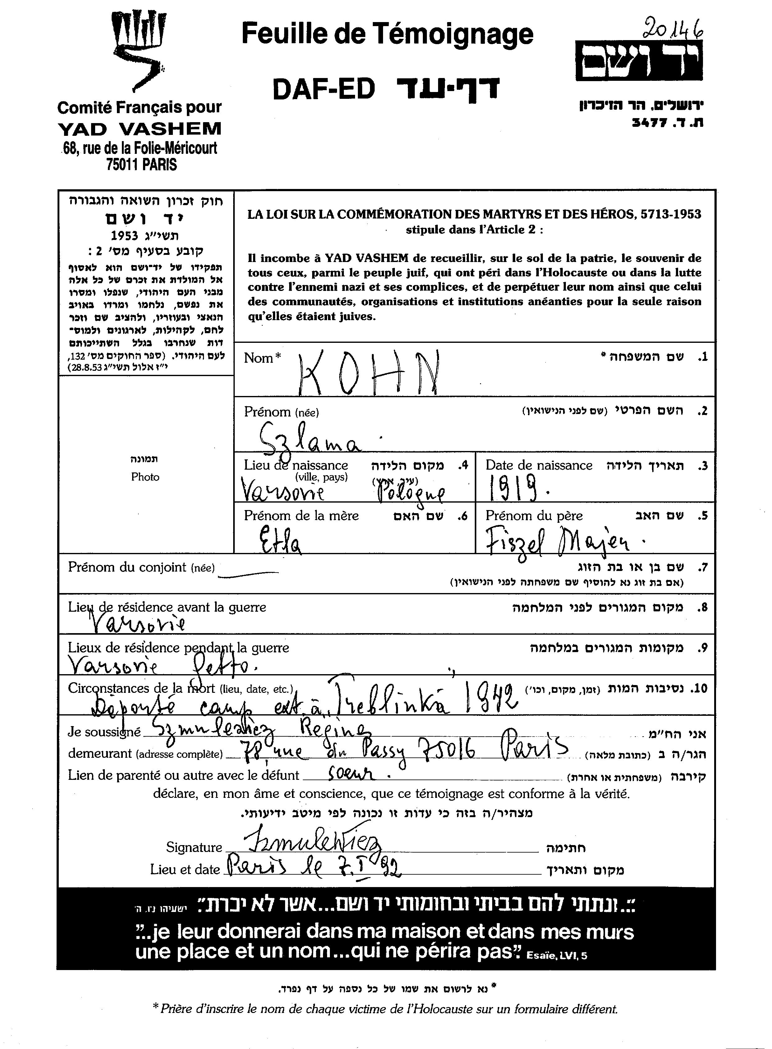 Szlama Kohn wurde im Jahr 1919 in Warszawa, Polen geboren. Er war der Sohn von Fishel Majer und Etla, geb. Klaner. Vor dem Zweiten Weltkrieg lebte er in Warszawa, Polen. Während des Krieges war er in Warszawa, Polen.