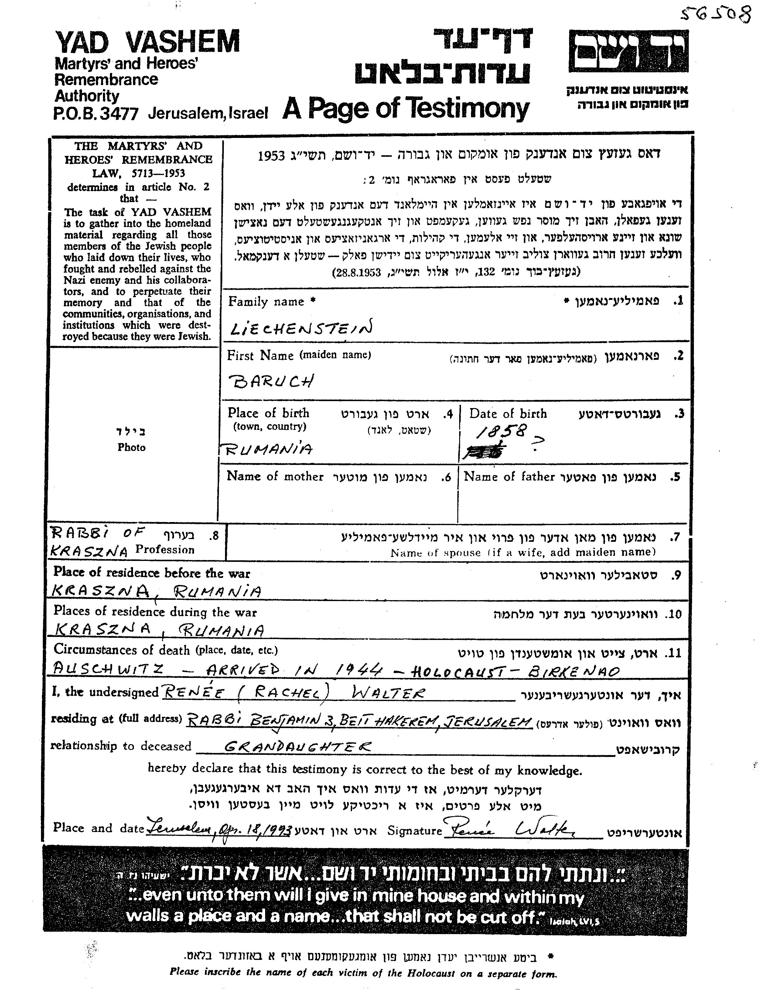 Baruch Liechtenstein wurde im Jahr 1858 in Rumänien geboren. Er war Rabbiner und Verheiratet. Vor dem Zweiten Weltkrieg lebte er in Kraszna, Rumänien. Während des Krieges war er in Kraszna, Rumänien.