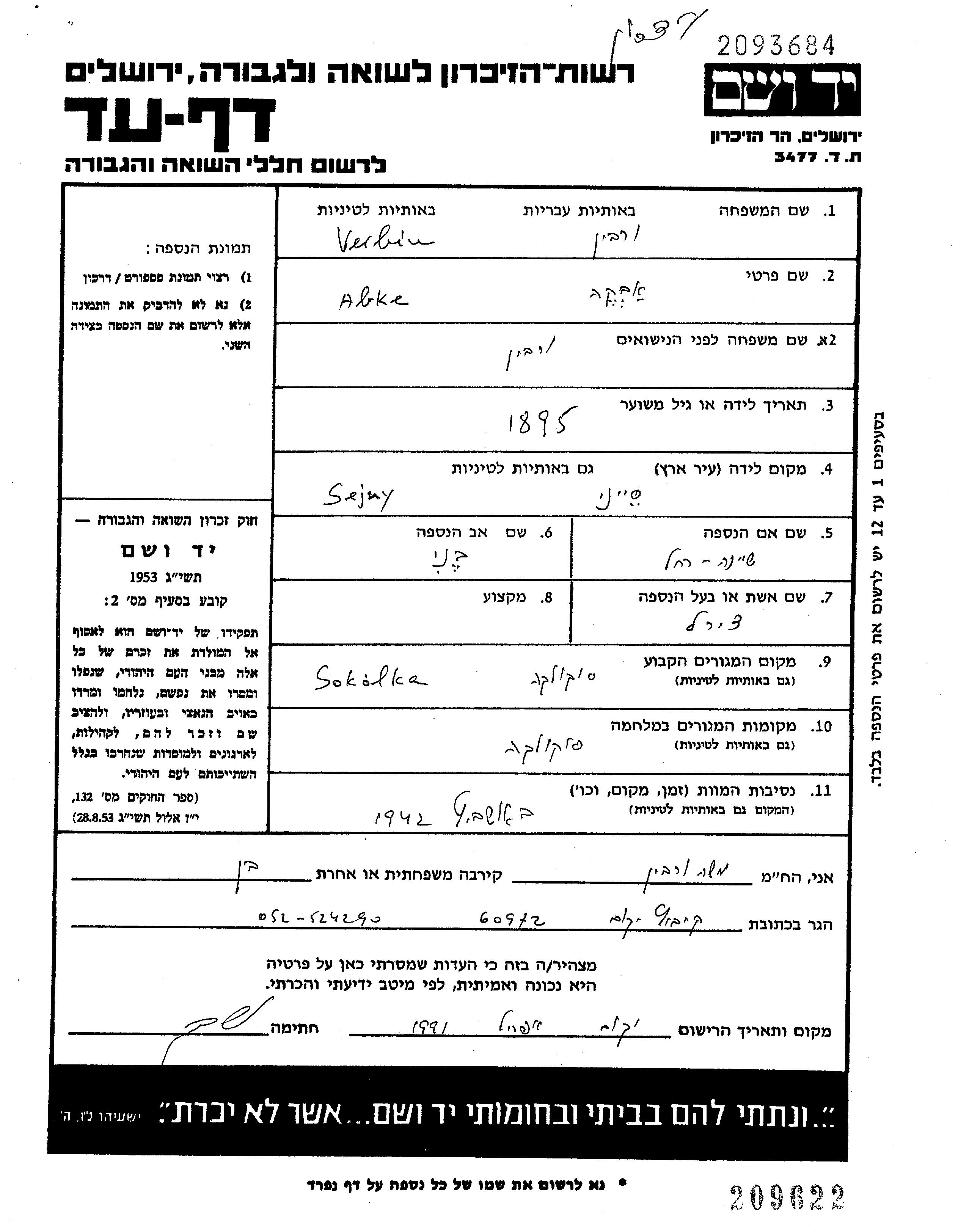 Abe Abke Werbin wurde in Sejny, Polen geboren. Er war der Sohn von Beni und Rakhel. Er war mit Cirl Cyla Verheiratet. Vor dem Zweiten Weltkrieg lebte er in Sokolka, Polen. Während des Krieges war er in Sokolka, Polen.
