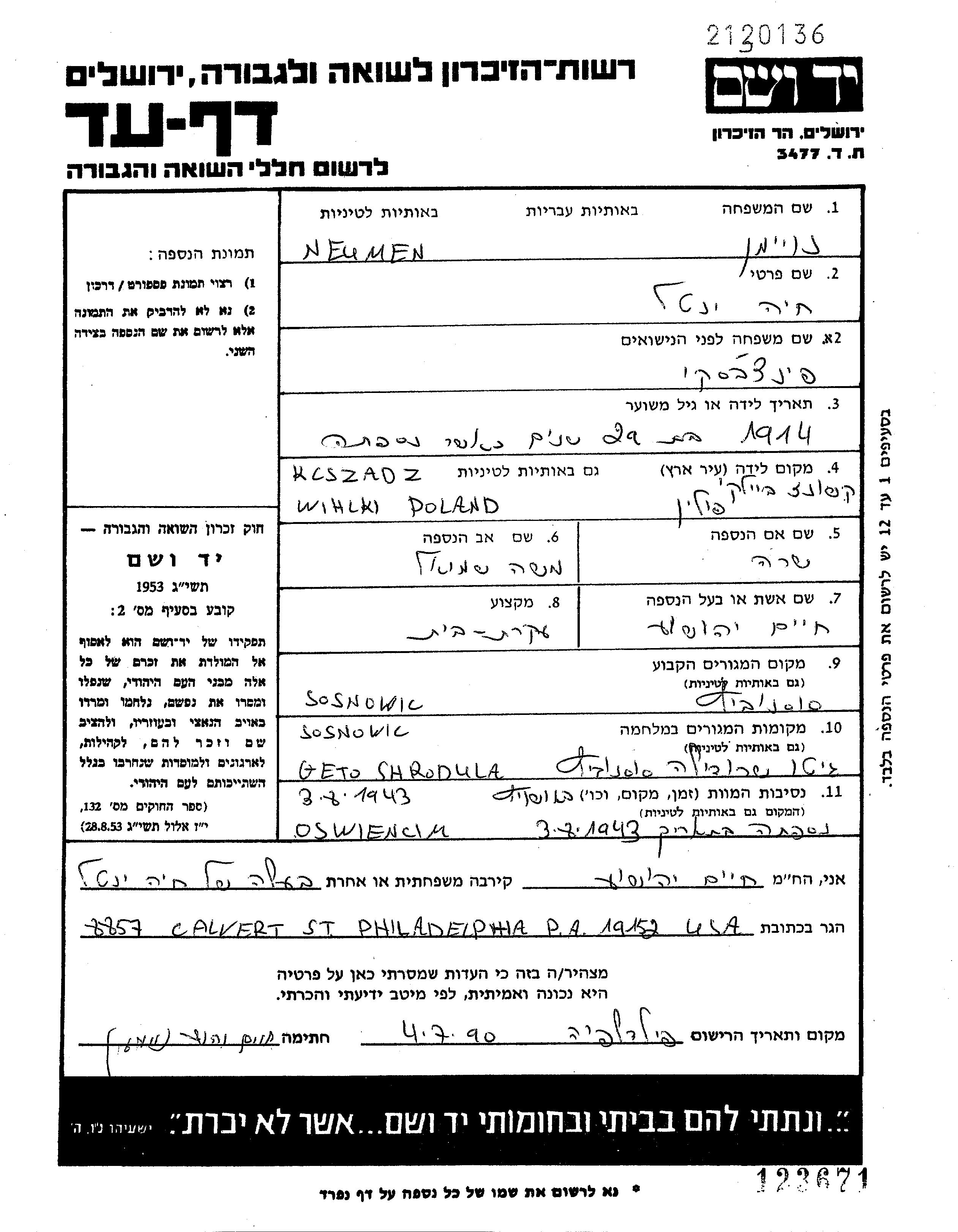 Yentel Khaia Neuman, geb. Pinchevski wurde im Jahr 1914 in Ksiaz Wielki, Polen geboren. Sie war die Tochter von Moshe Shmuel und Sara. Sie war Hausfrau und mit Khaim Yehoshua Verheiratet. Vor dem Zweiten Weltkrieg lebte sie in Sosnowiec, Polen. Während des Krieges war sie in Sosnowiec, Polen.
