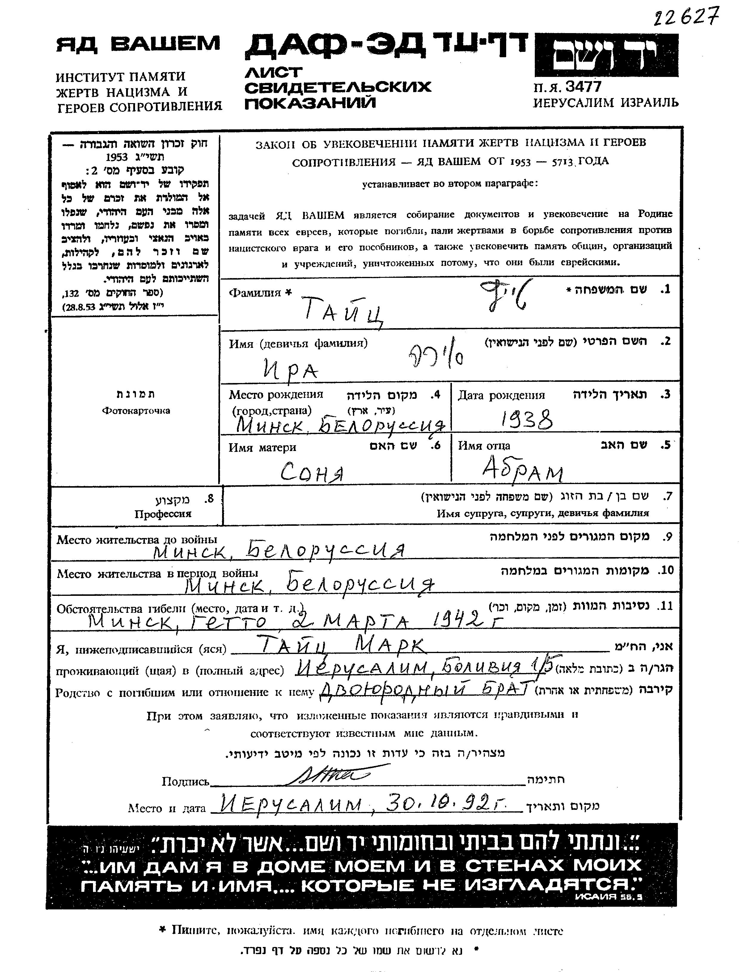 Taitz Ira 1938 Minsk, Weißrussland (UdSSR) Gedenkblatt