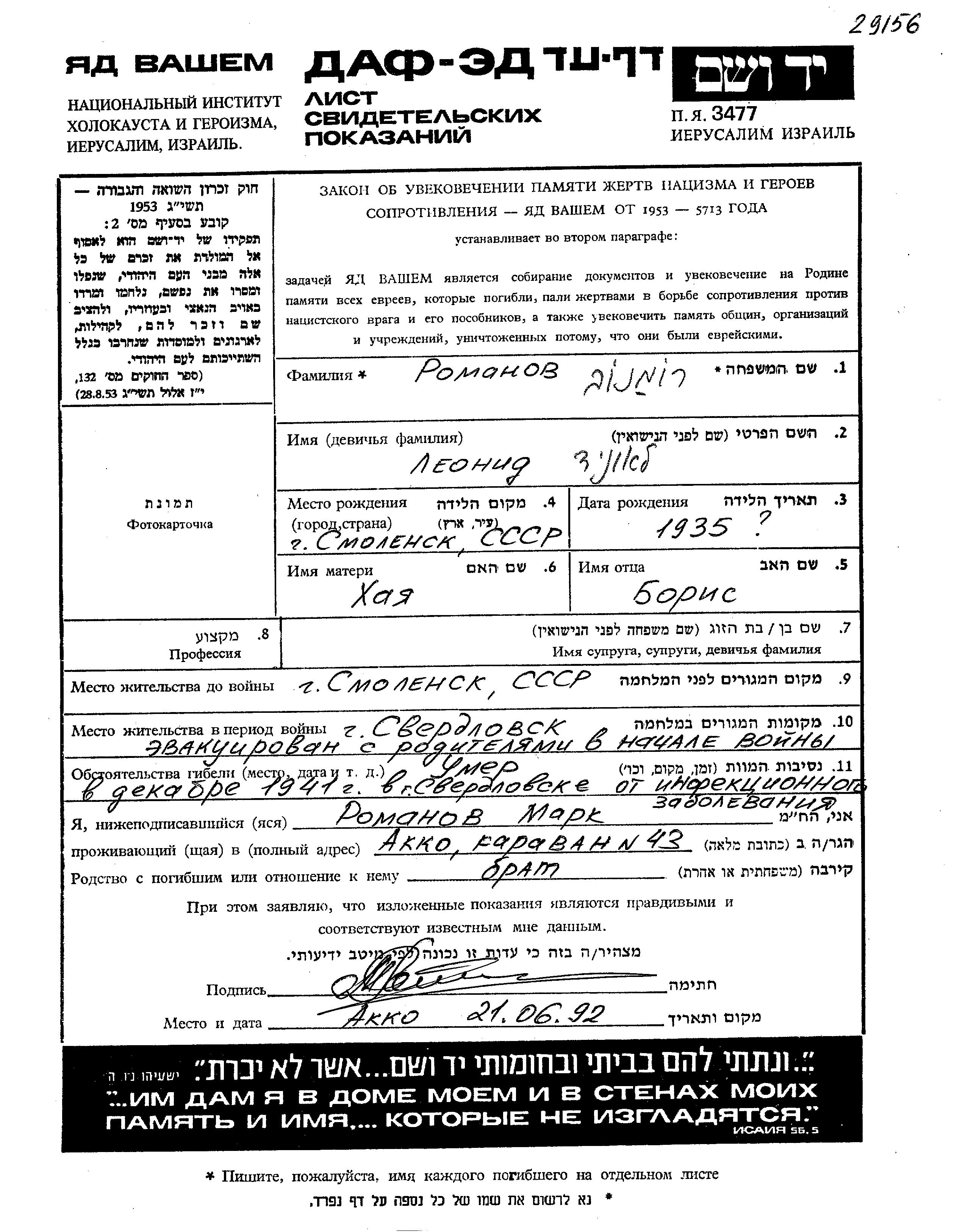 Leonid wurde in der Schoah ermordet. Todesort: Sverdlovsk, Russland (UdSSR) im Jahr 1941.
