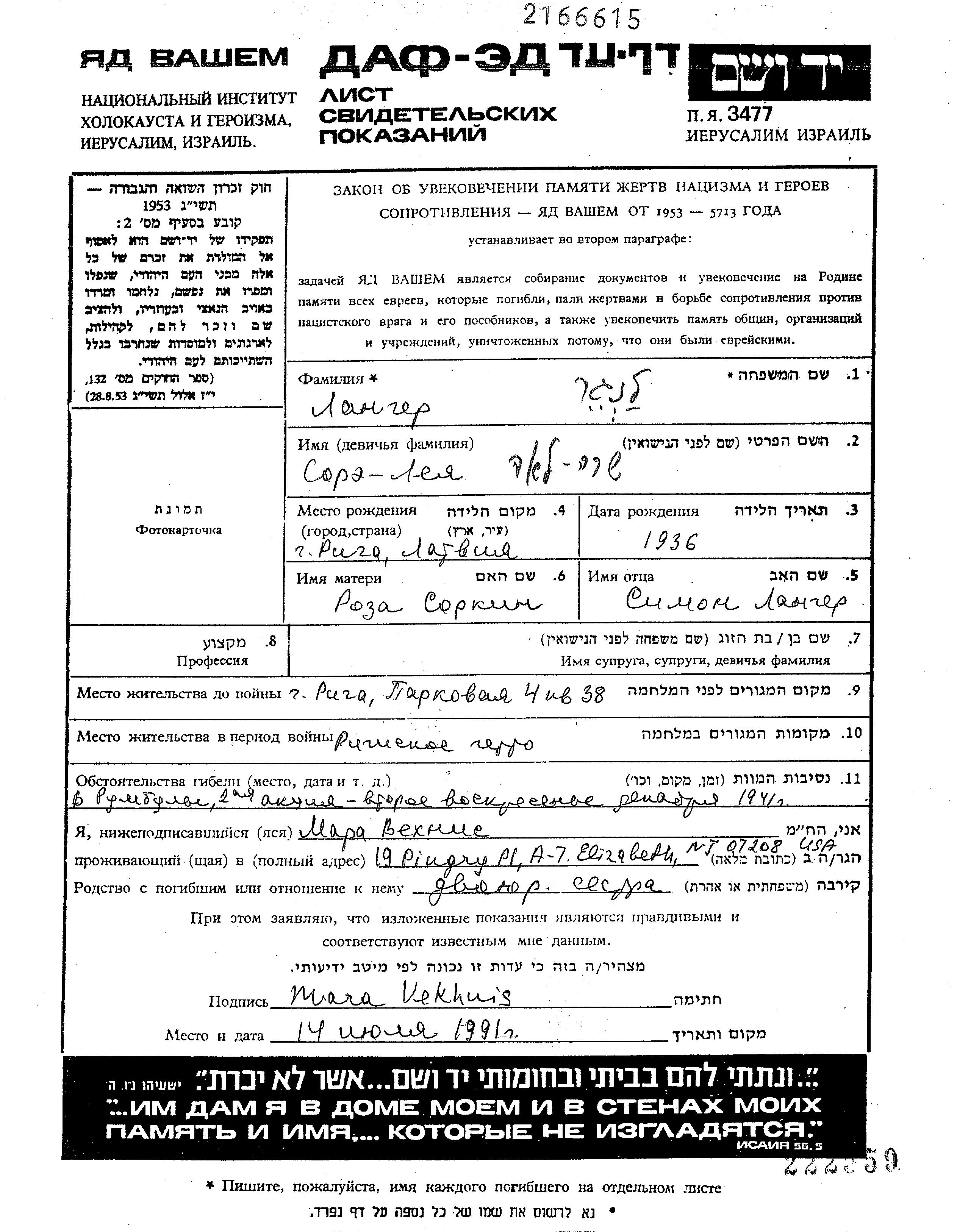 Sore Lea Langer wurde im Jahr 1936 in Riga, Lettland geboren. Sie war die Tochter von Simon und Roza, geb. Sorkin. Sie war Kind. Vor dem Zweiten Weltkrieg lebte sie in Riga, Lettland. Während des Krieges war sie in Riga, Lettland.