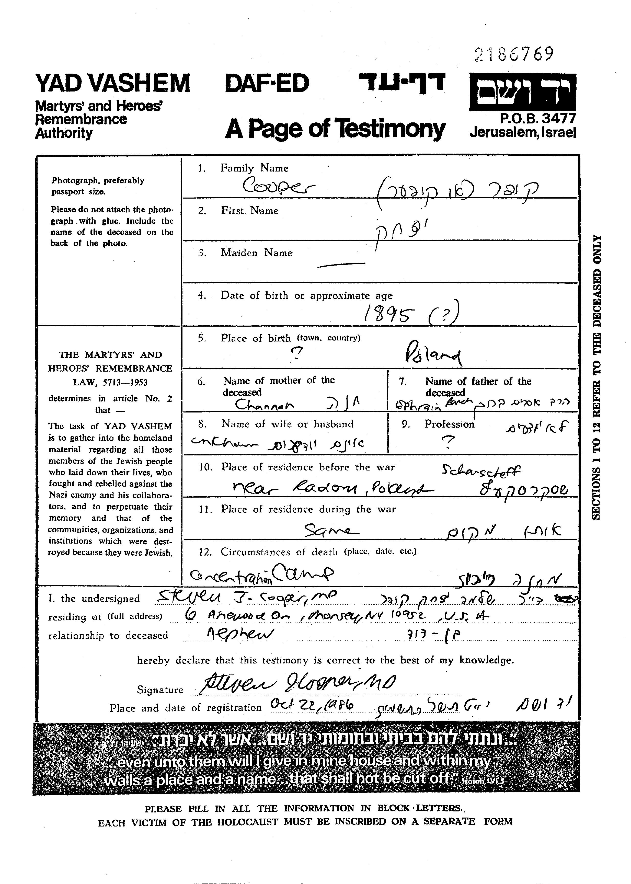Itzak Cooper wurde im Jahr 1895 in Polen geboren. Er war der Sohn von Efraim Barukh und Channah. Er war mit Ines Verheiratet. Vor dem Zweiten Weltkrieg lebte er in Skaryszew, Polen. Während des Krieges war er in Skaryszew, Polen.