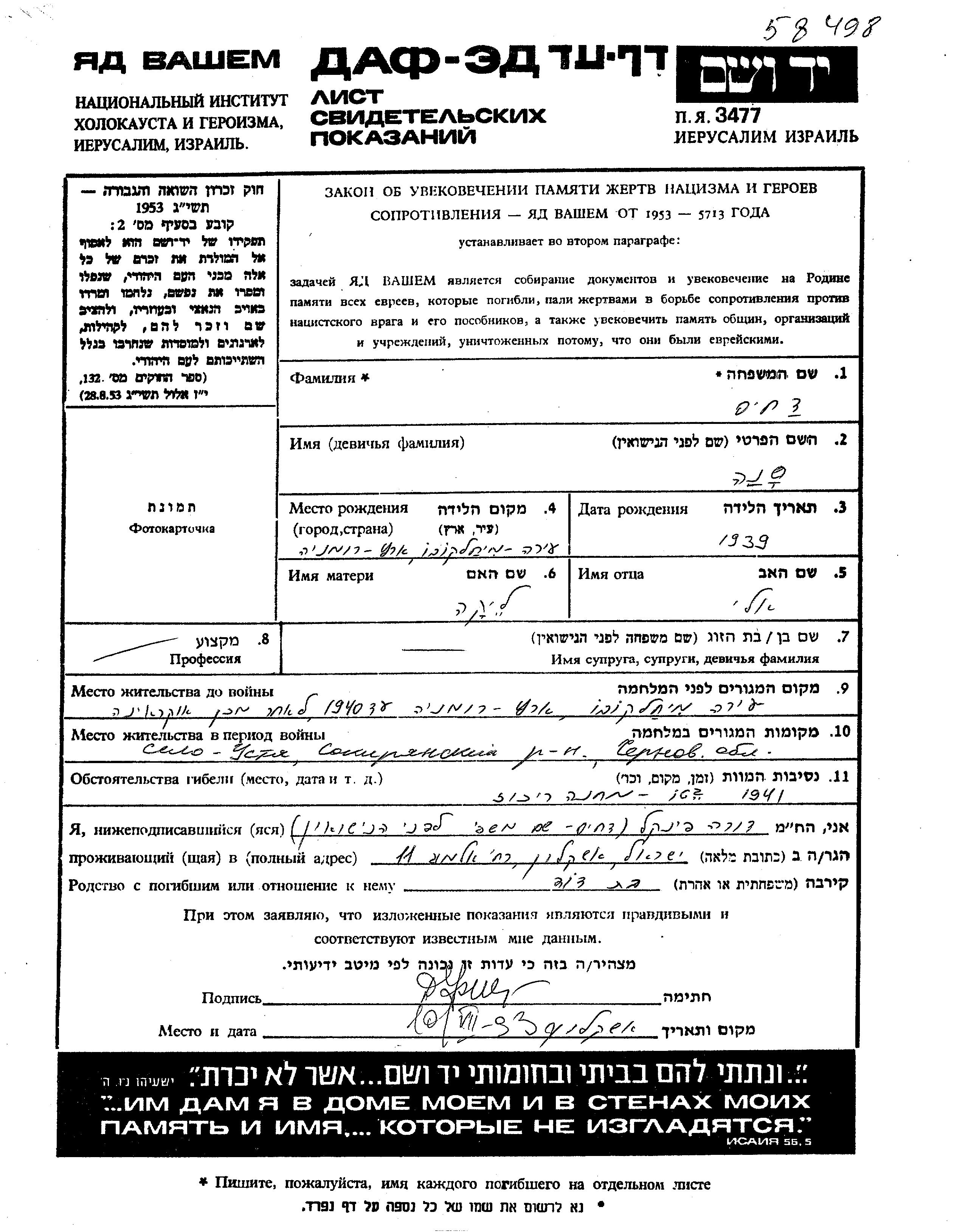 Deikhes Sona 1939 Mikhalkovo, Rumänien Gedenkblatt