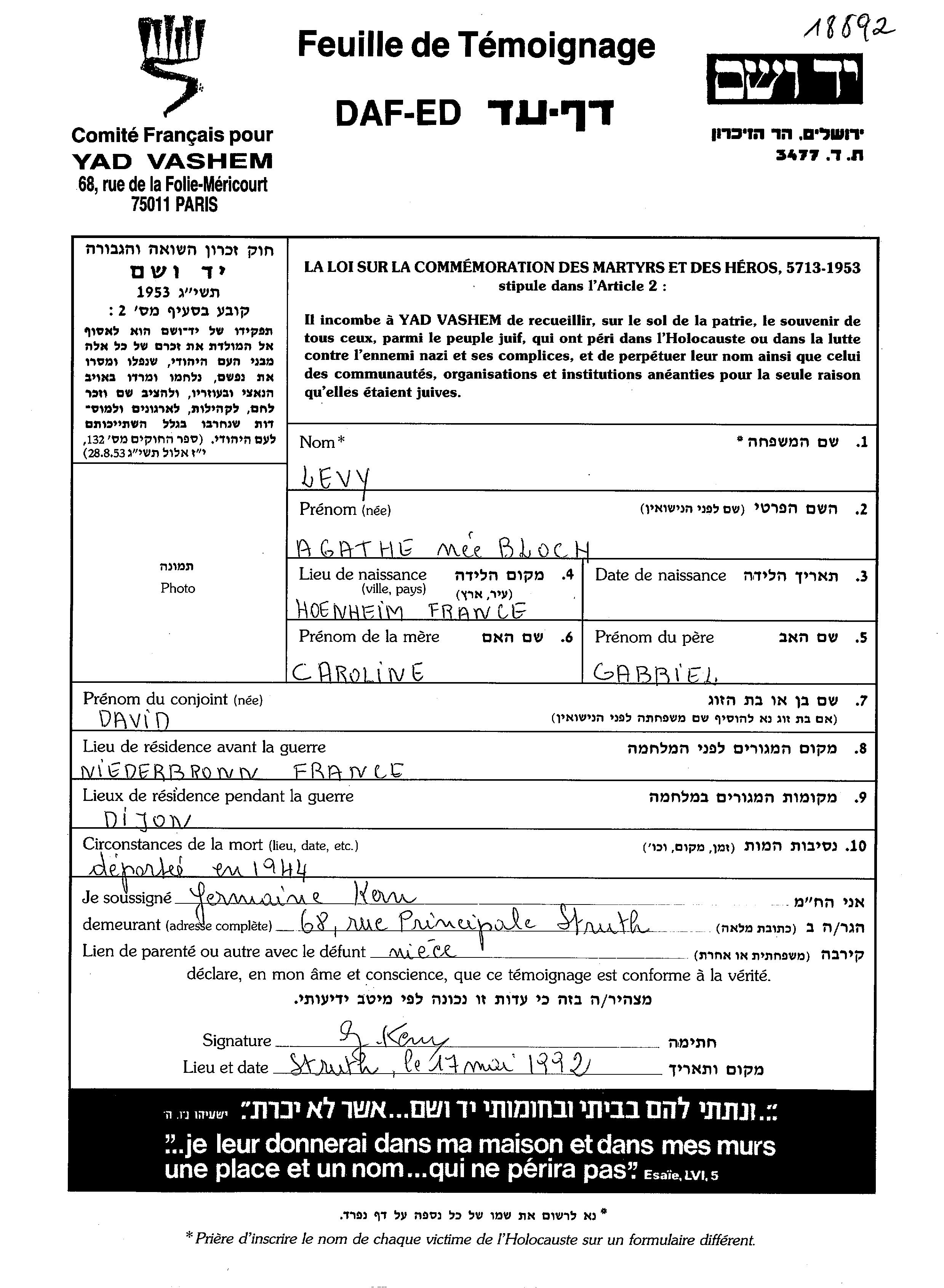 Agathe Levy, geb. Bloch wurde in Hoenheim, Frankreich geboren. Sie war die Tochter von Gabriel und Caroline. Sie war mit David Verheiratet. Vor dem Zweiten Weltkrieg lebte sie in Niederbronn les Bain, Frankreich. Während des Krieges war sie in Dijon, Frankreich.