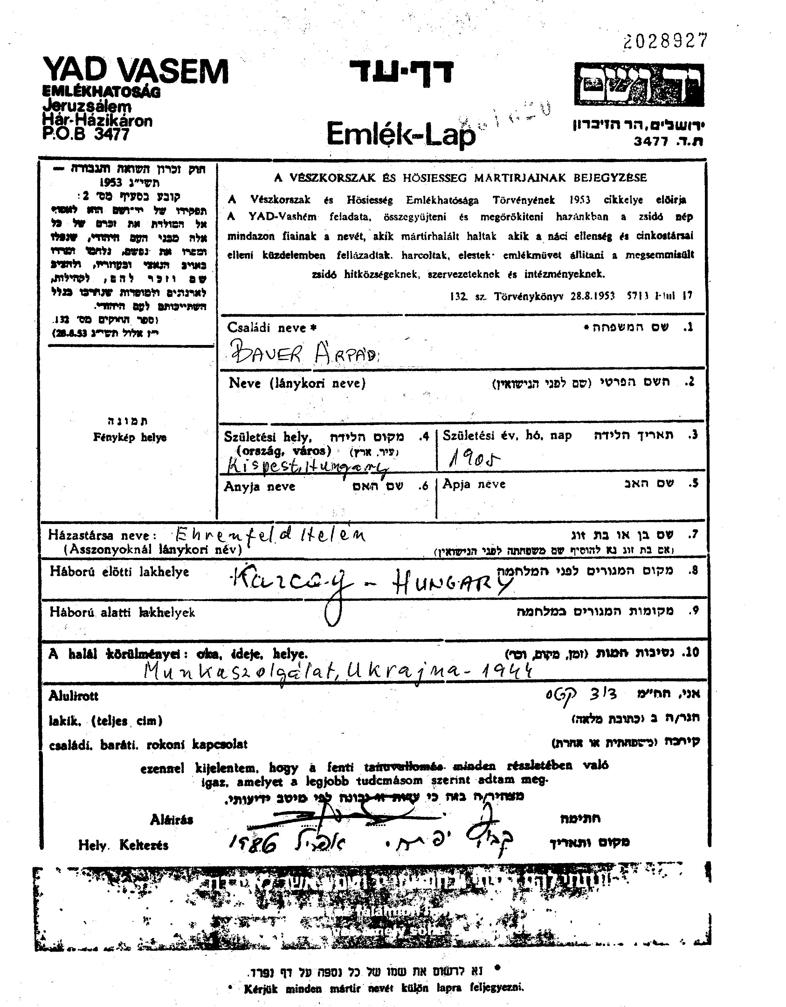 Arpad Bauer wurde im Jahr 1905 in Kispest, Ungarn geboren. Er war mit Helen Verheiratet. Vor dem Zweiten Weltkrieg lebte er in Karcag, Ungarn. Während des Krieges war er in Zwangsarbeit Bataillone MUSZ in die Ungarischen Streitkräfte.