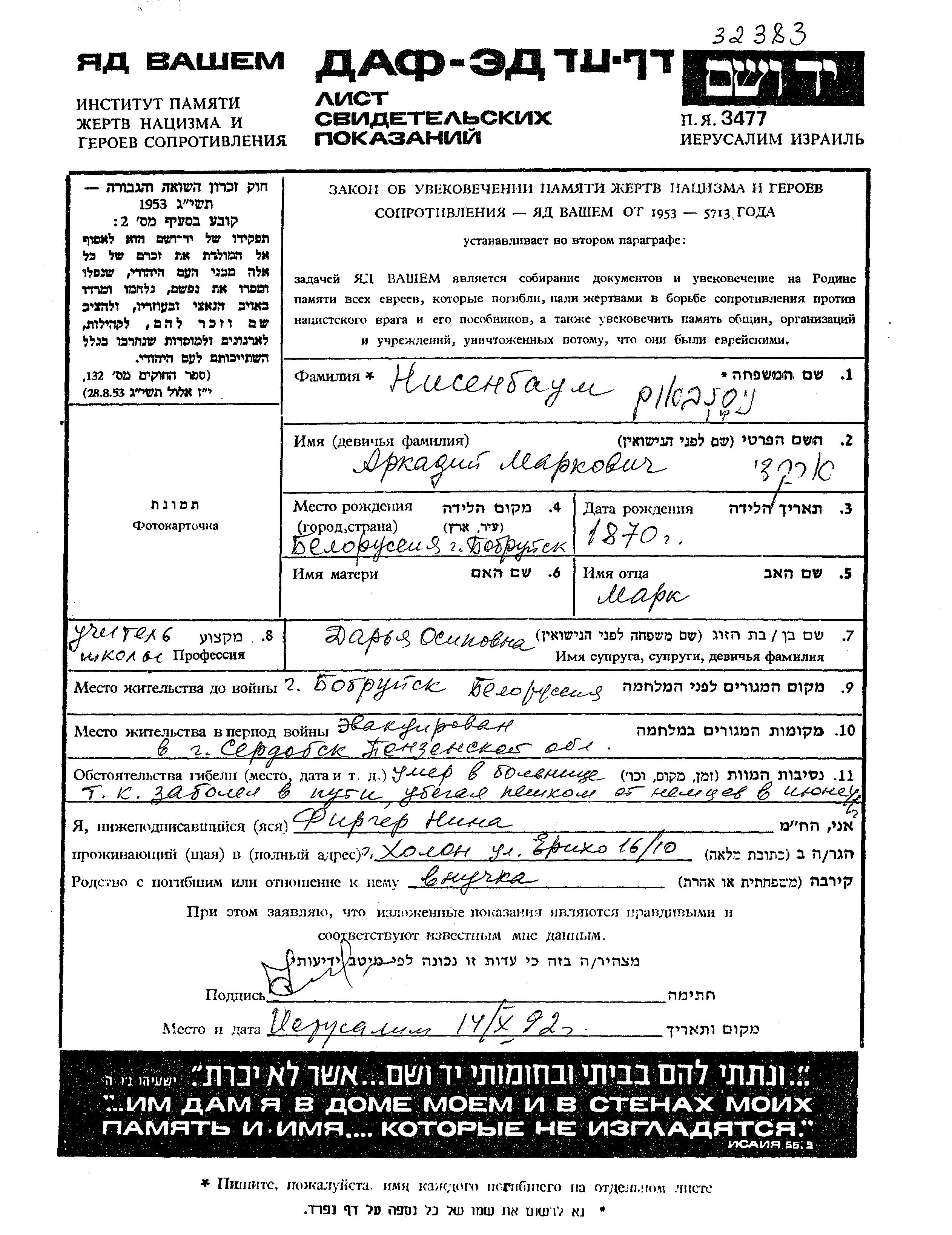 Arkadi Nisenbaum wurde im Jahr 1870 in Bobruysk, Weißrussland (UdSSR) geboren. Er war der Sohn von Mark. Er war Lehrer/in und mit Daria Verheiratet. Vor dem Zweiten Weltkrieg lebte er in Bobruysk, Weißrussland (UdSSR). Während des Krieges war er in Serdobsk, Russland (UdSSR).