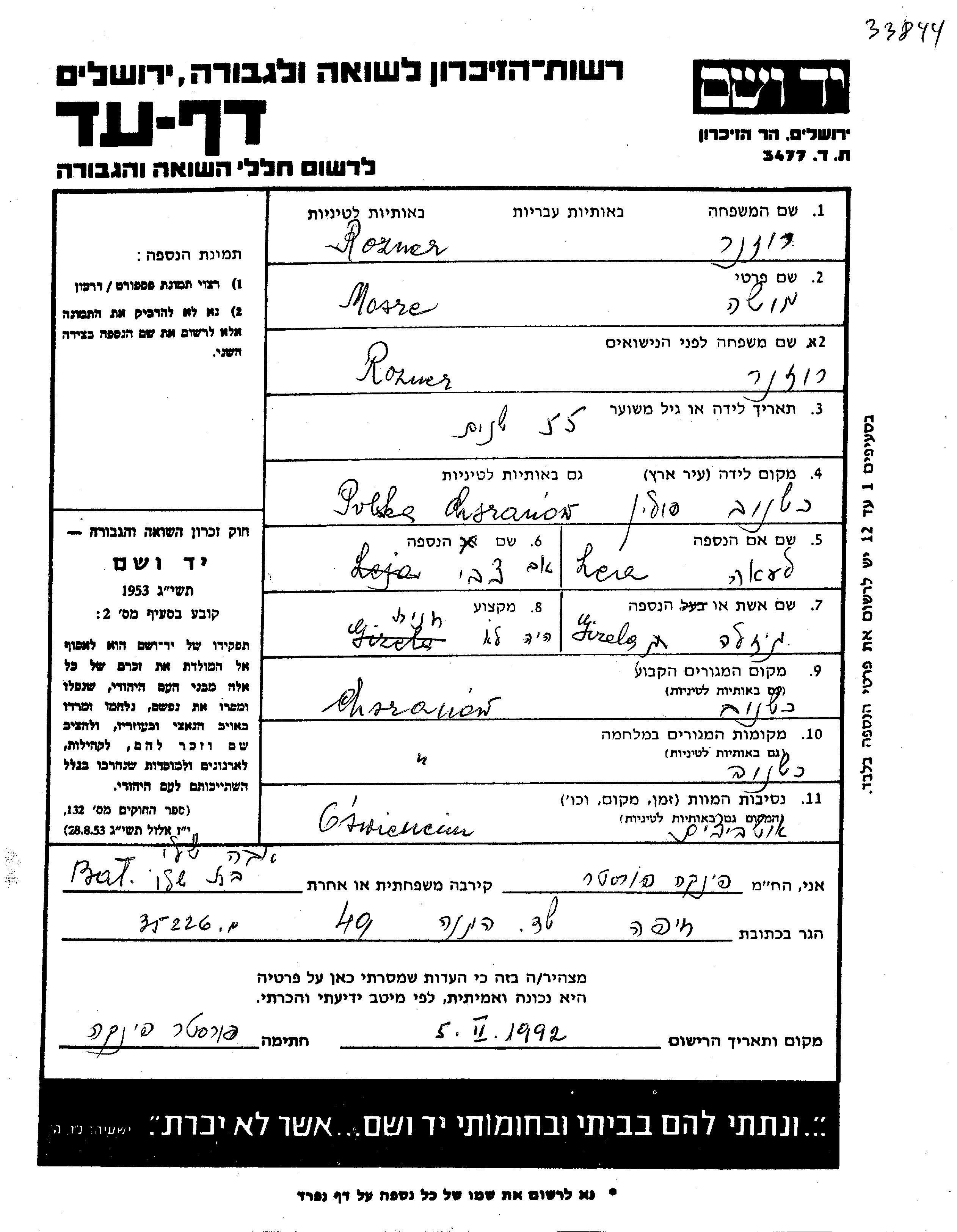 Rozner Mosze Chrzanow, Polen Gedenkblatt
