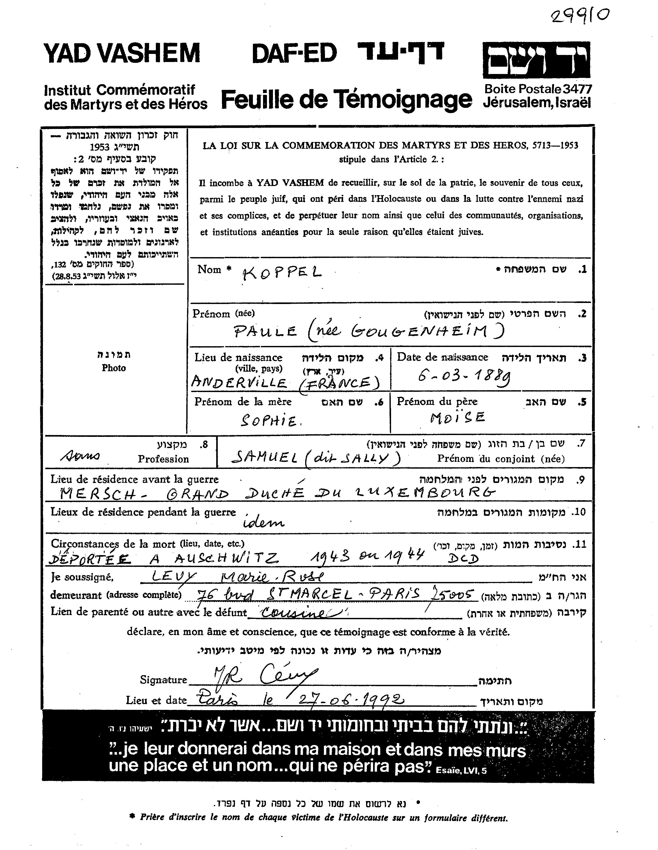 Paule Paul Koppel wurde im Jahr 1889 in Andeville, Frankreich geboren. Er war der Sohn von Moise und Sophie. Er war mit Sally Samuel, geb. Gougenheim Verheiratet. Vor dem Zweiten Weltkrieg lebte er in Mersch, Litauen. Während des Krieges war er in Mersch, Litauen.