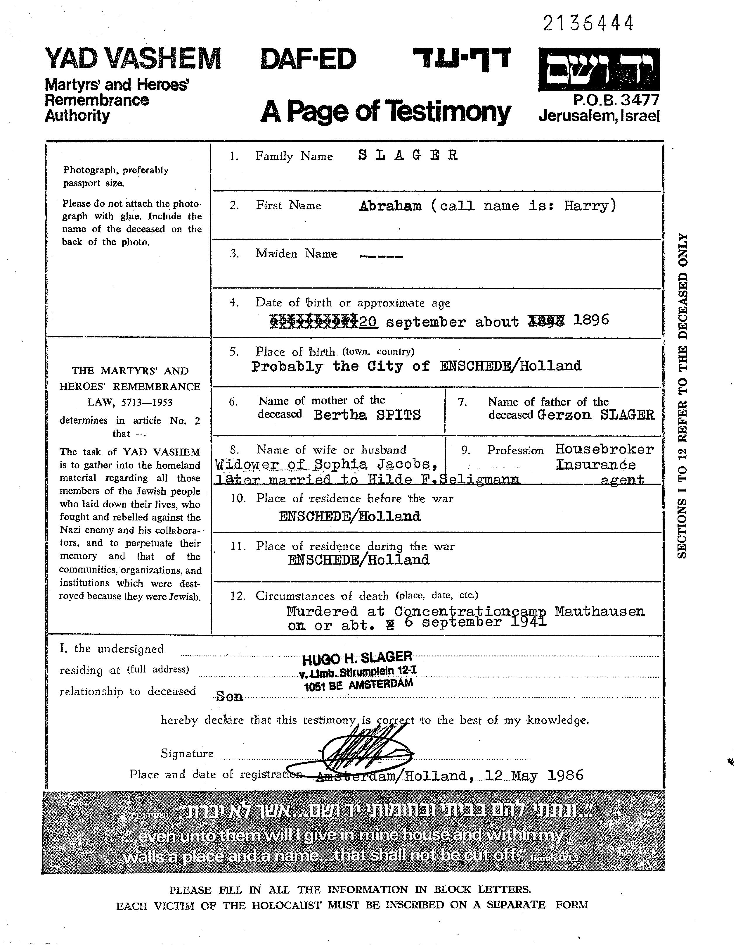 Abraham Harry Slager Slakher wurde im Jahr 1896 in Enschede, Niederlande geboren. Er war der Sohn von Gershon und Bertha, geb. Spits. Er war Versicherungsmakler/-in und mit Hilde Verheiratet. Vor dem Zweiten Weltkrieg lebte er in Enschede, Niederlande. Während des Krieges war er in Enschede, Niederlande.