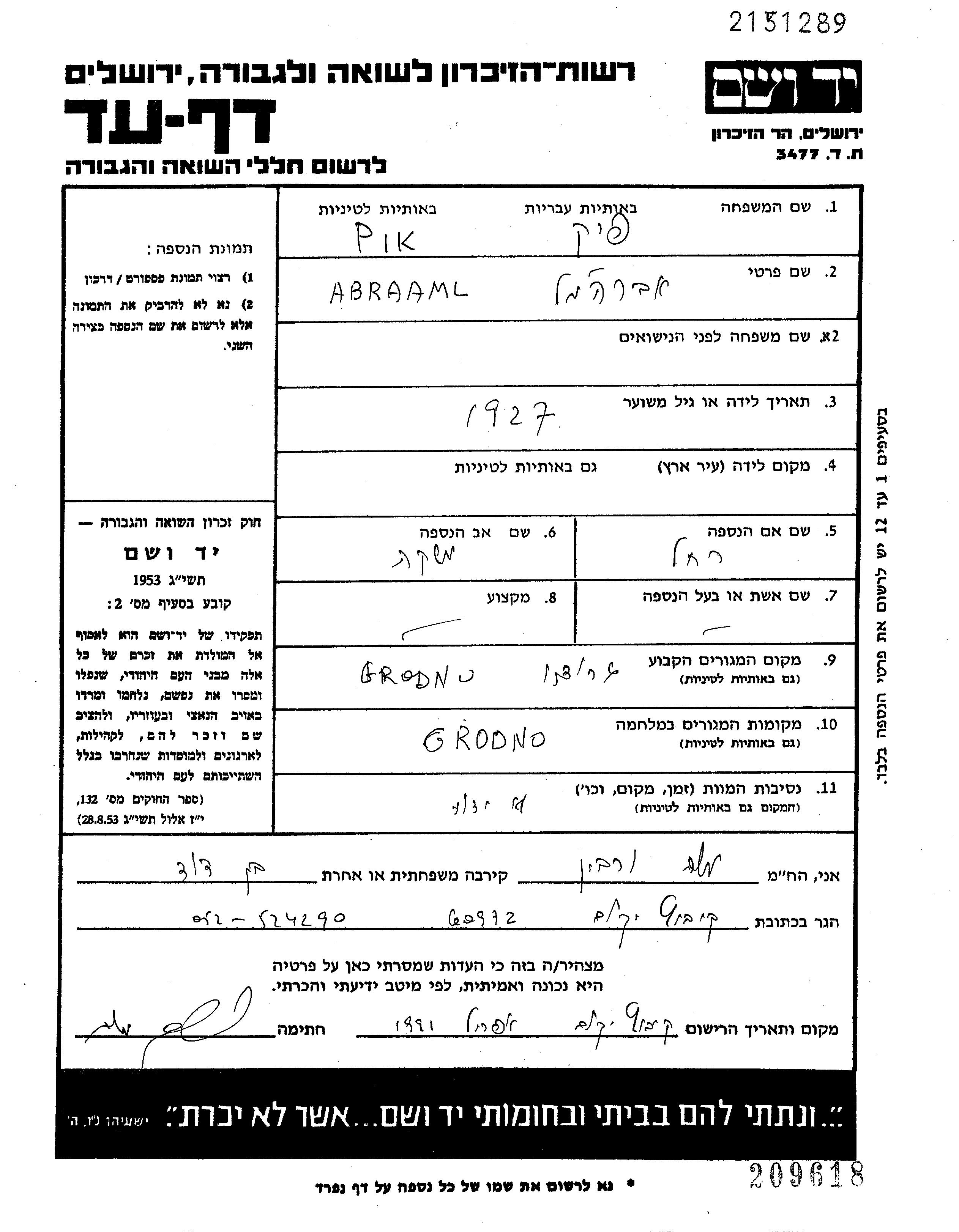 Abraaml Pik wurde im Jahr 1927 geboren. Er war der Sohn von Moshke und Rakhel. Er war Kind. Vor dem Zweiten Weltkrieg lebte er in Grodno, Polen. Während des Krieges war er in Grodno, Polen.