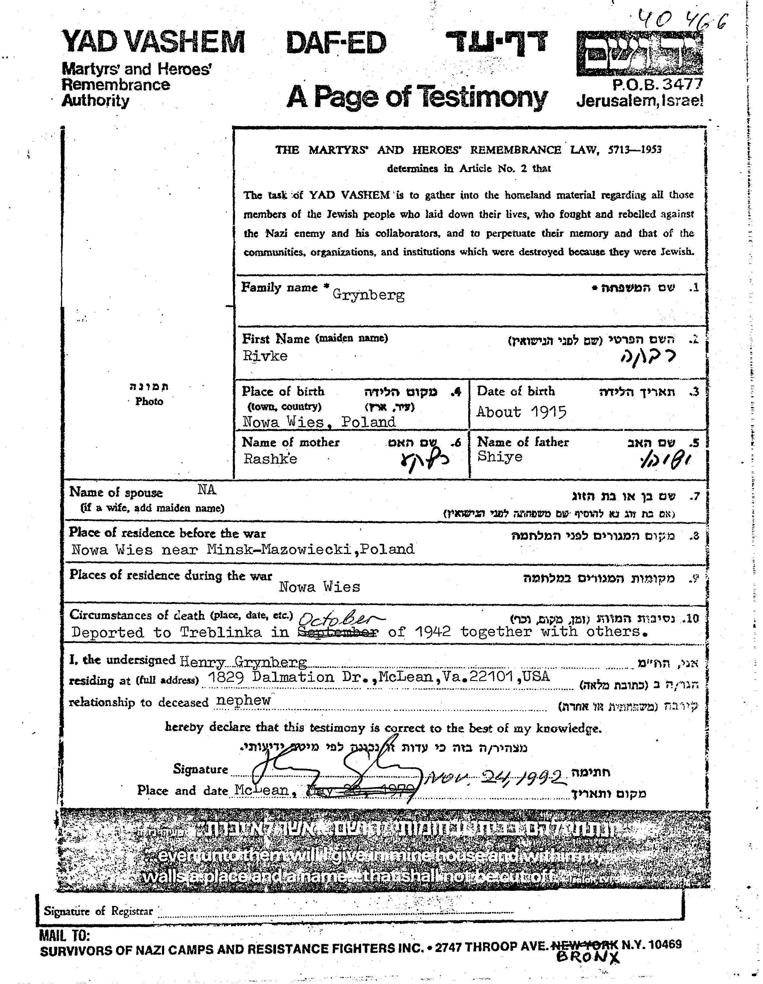 Grynberg Rivke 1915 Nowa Wies, Polen Gedenkblatt
