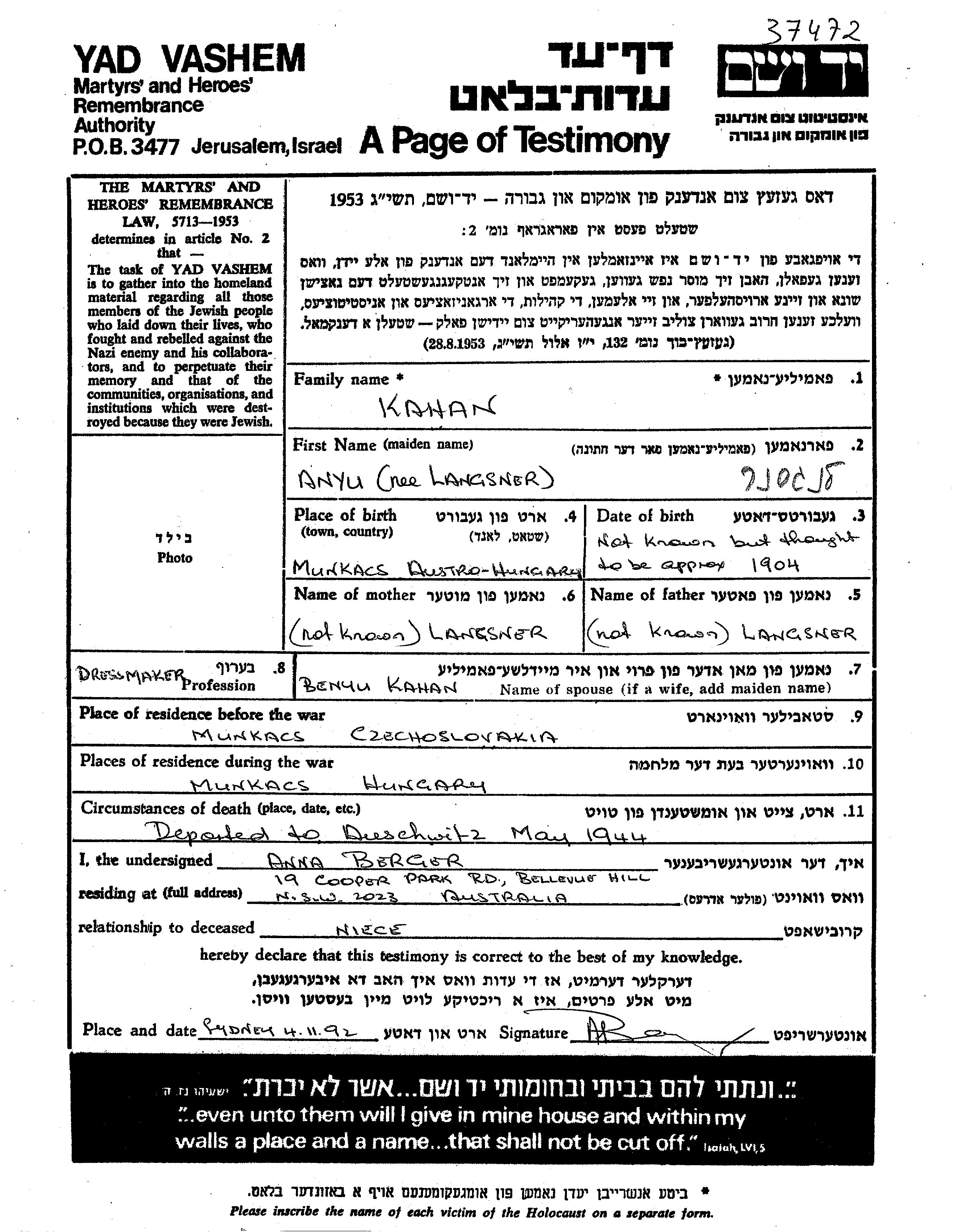Anyu Enio Kahan, geb. Langsner wurde im Jahr 1904 in Munkacs, Tschechoslowakei geboren. Sie war Schneiderin und mit Benyu Benya Verheiratet. Vor dem Zweiten Weltkrieg lebte sie in Munkacs, Tschechoslowakei. Während des Krieges war sie in Munkacs, Tschechoslowakei.