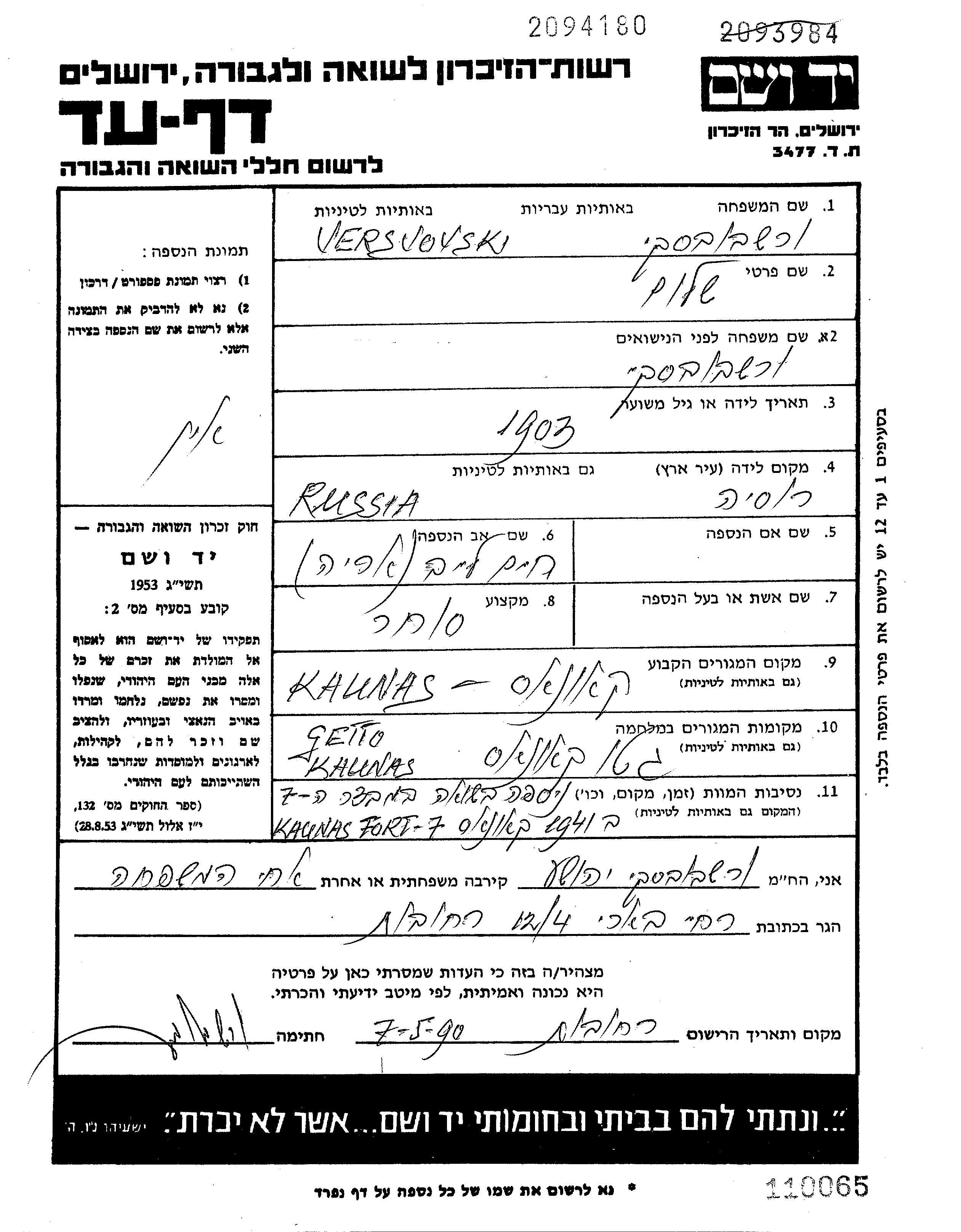 Shalom Versvovski wurde in Russland (UdSSR) geboren. Er war der Sohn von Khaim Leib Arie. Er war Kaufmann/-frau und mit Rakhel Verheiratet. Vor dem Zweiten Weltkrieg lebte er in Kaunas, Litauen. Während des Krieges war er in Kaunas, Litauen.