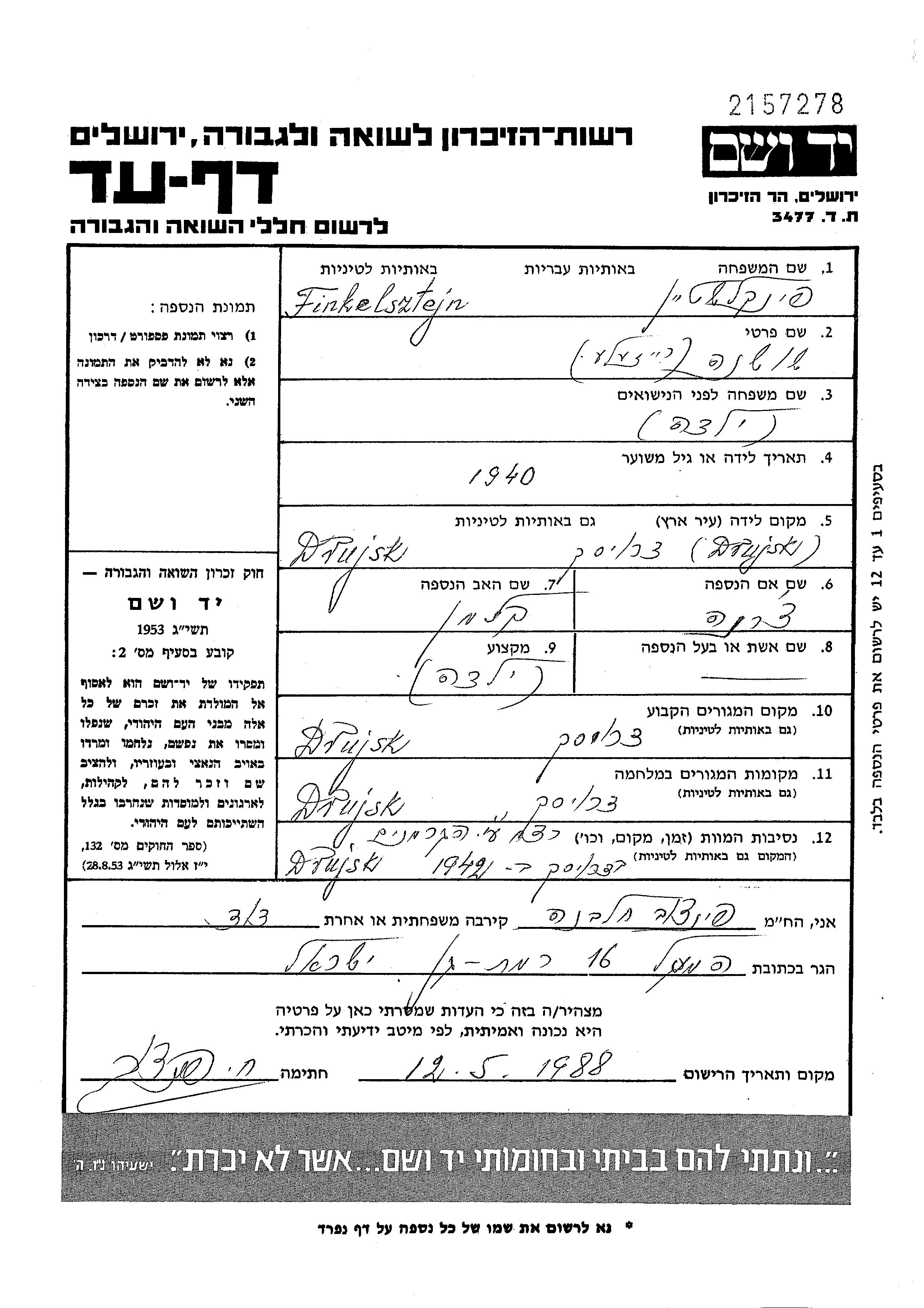 Reizele Shoshana Finkelsztejn wurde im Jahr 1940 in Drujsk, Polen geboren. Sie war die Tochter von Kalman und Charna, geb. Deich. Sie war Kind. Vor dem Zweiten Weltkrieg lebte sie in Drujsk, Polen. Während des Krieges war sie in Drujsk, Polen.