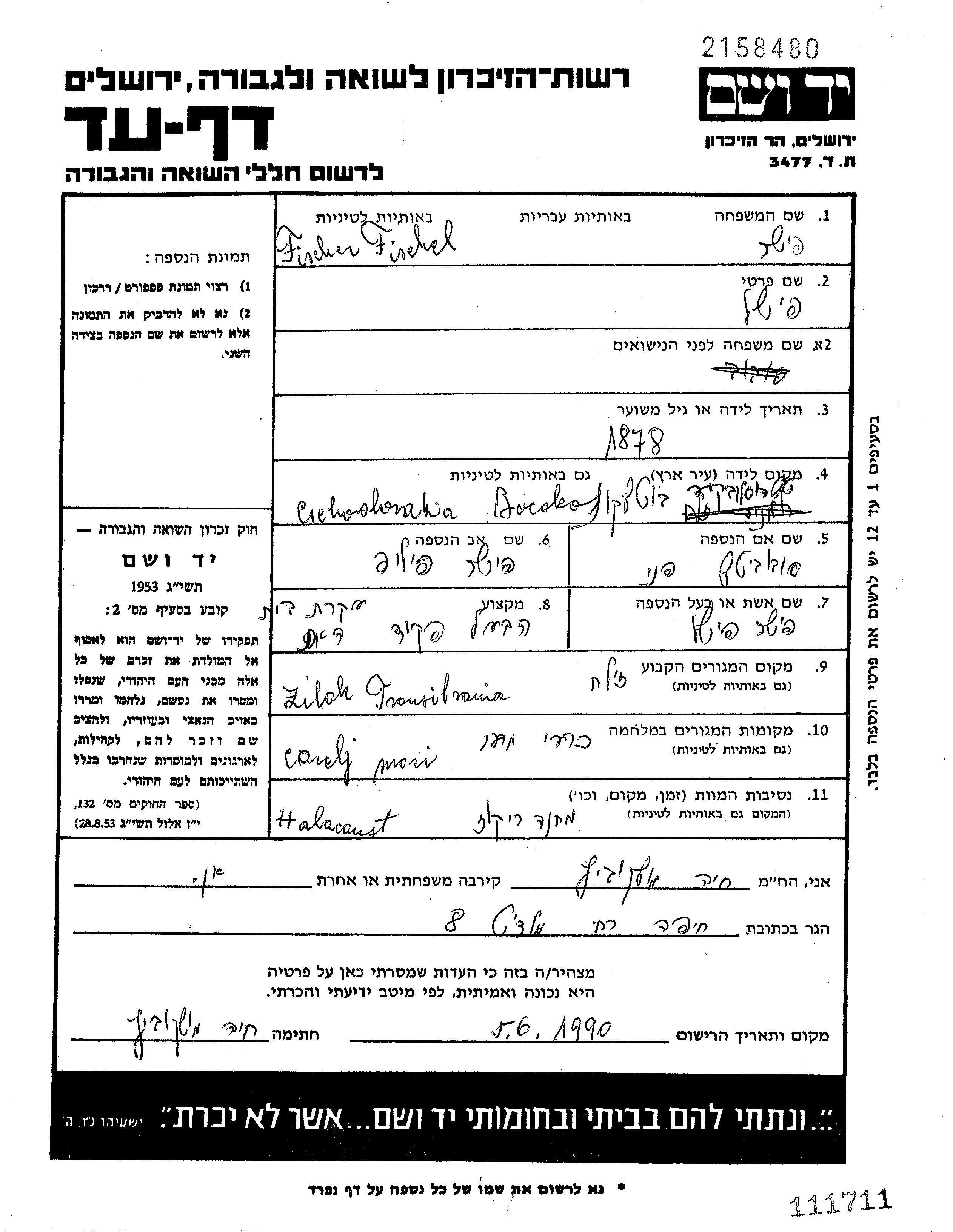 Fishel Fischer wurde im Jahr 1878 in Bacska, Tschechoslowakei geboren. Er war der Sohn von Filip. Er war Angestellte/-r. Vor dem Zweiten Weltkrieg lebte er in Zilah, Rumänien. Während des Krieges war er in Carei Mare, Rumänien.