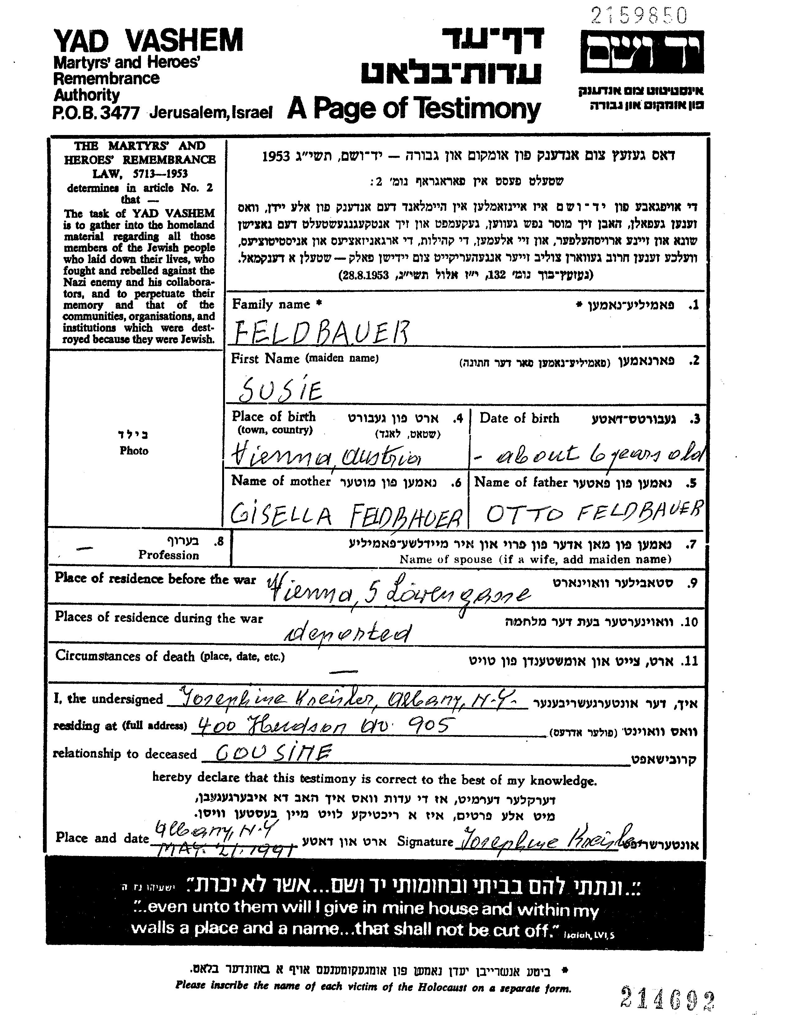 Feldbauer Susie Sosia Wien, Österreich Gedenkblatt