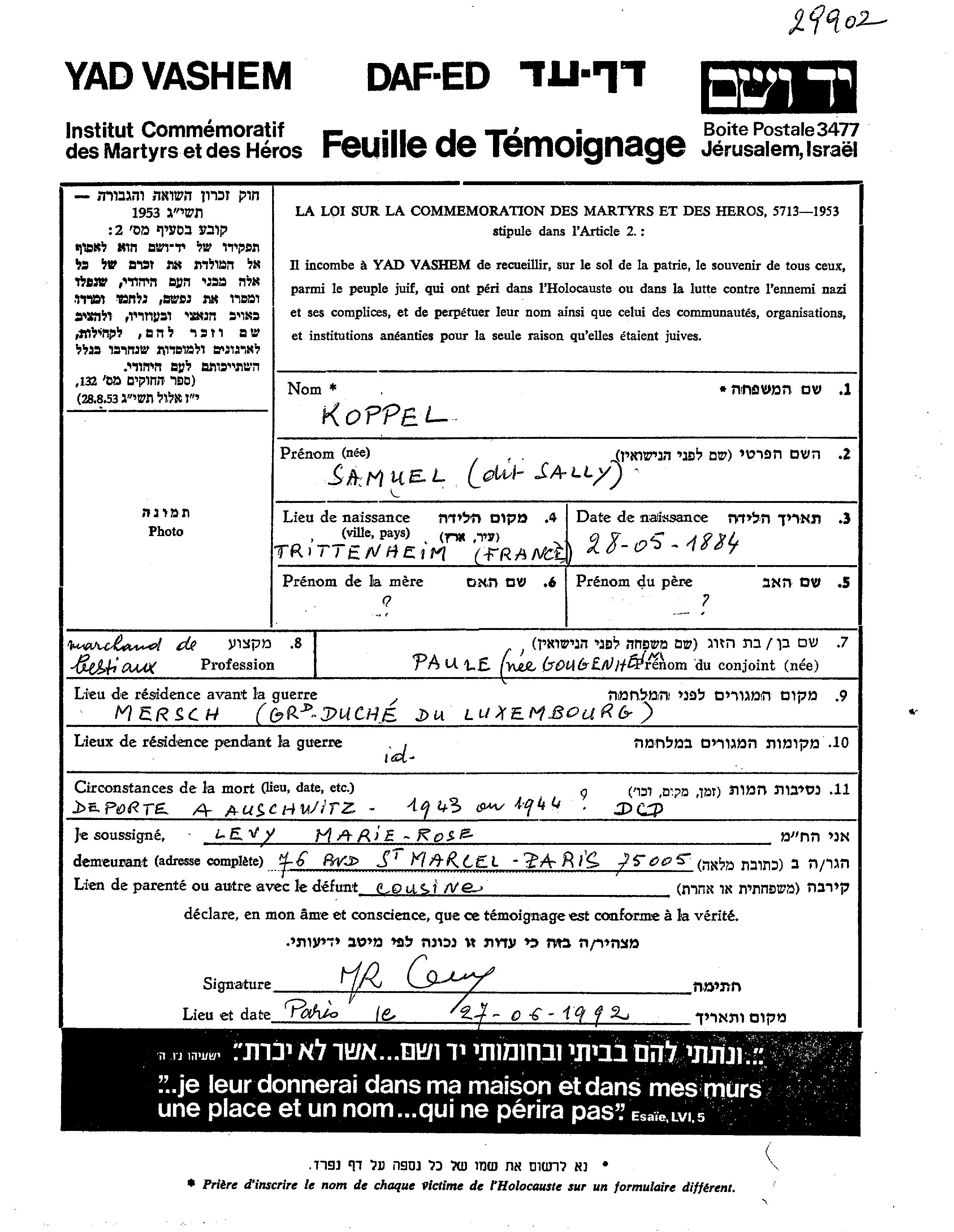Samuel Sally Koppel wurde im Jahr 1884 in Trittenheim, Deutsches Reich geboren. Er war Viehhändler und mit Paule, geb. Gougenheim Verheiratet. Vor dem Zweiten Weltkrieg lebte er in Mersch, Luxemburg. Während des Krieges war er in Mersch, Luxemburg.