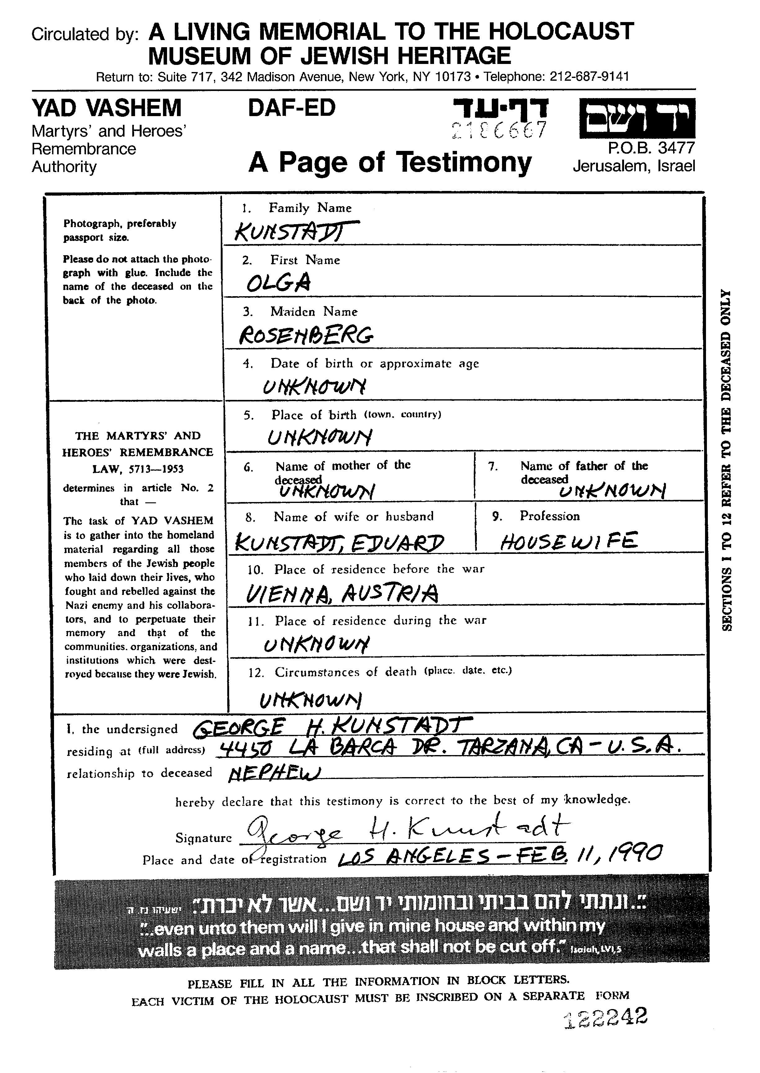 Olga Kunstadt, geb. Rosenberg. Sie war mit Eduard Verheiratet. Vor dem Zweiten Weltkrieg lebte sie in Wien, Österreich.