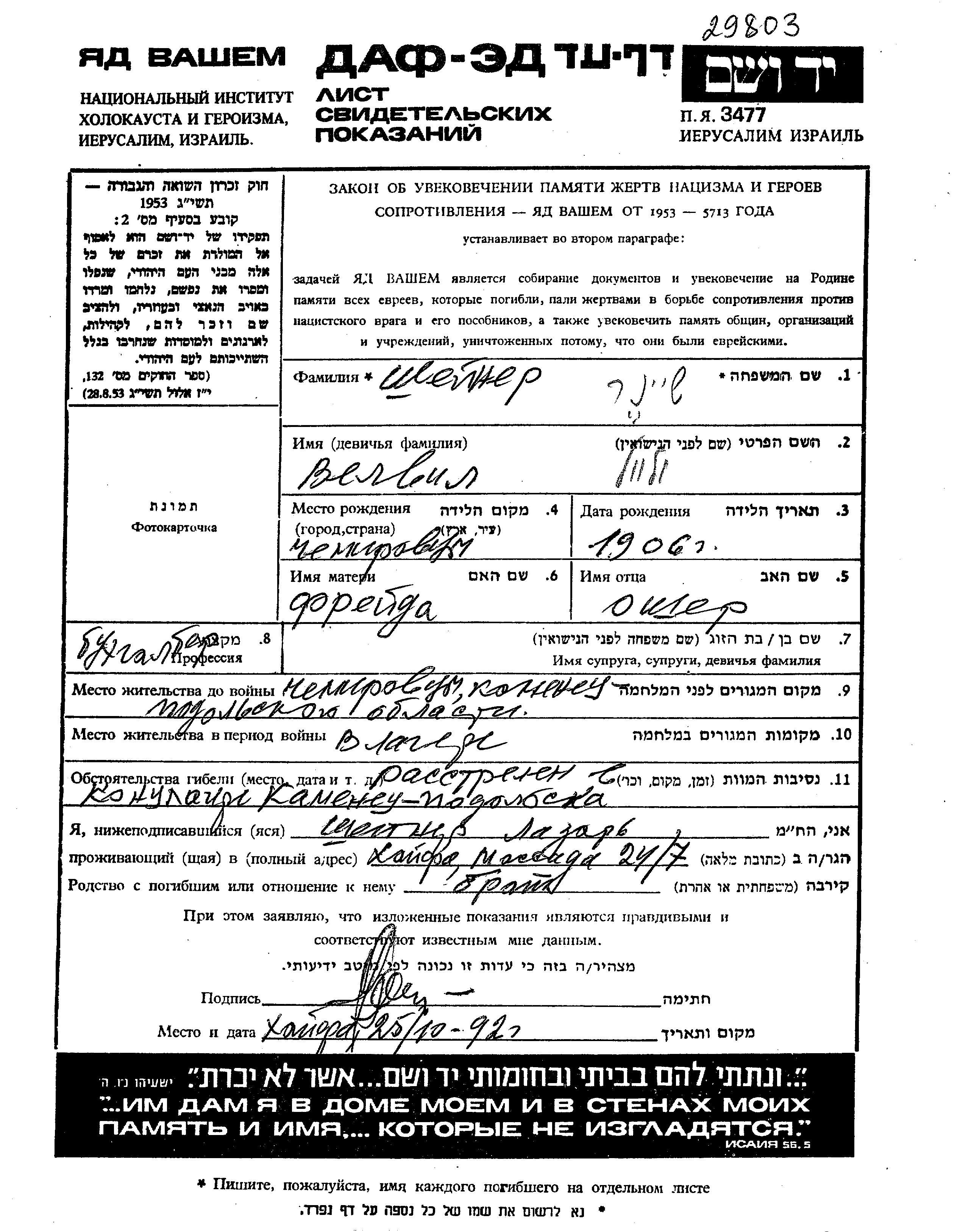 Velvel wurde in der Schoah ermordet. Todesort: Kamenets Podolsk, Ukraine (UdSSR).
