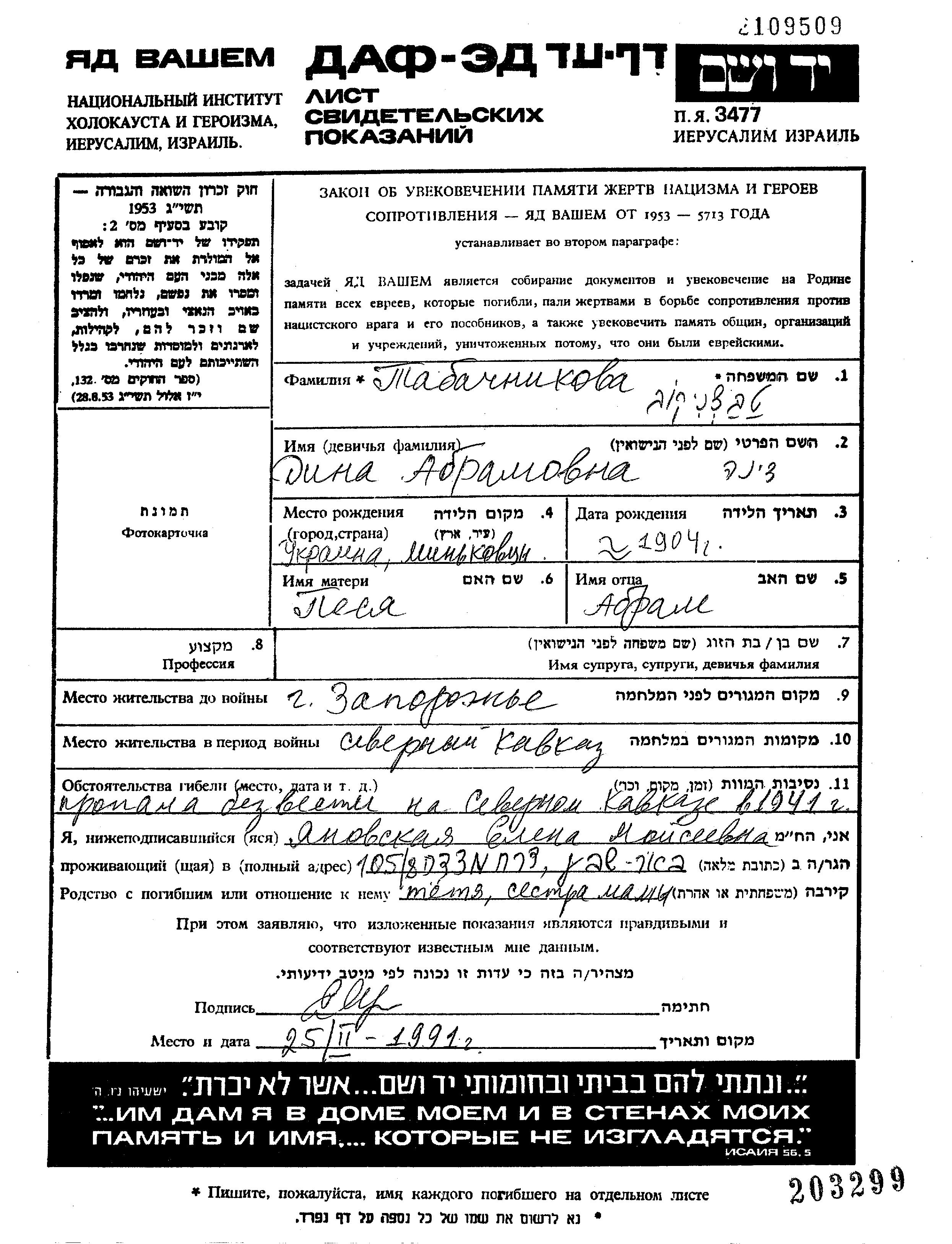 Tabachnikov Dina 1904 Zaporozhye, Ukraine (UdSSR) Gedenkblatt