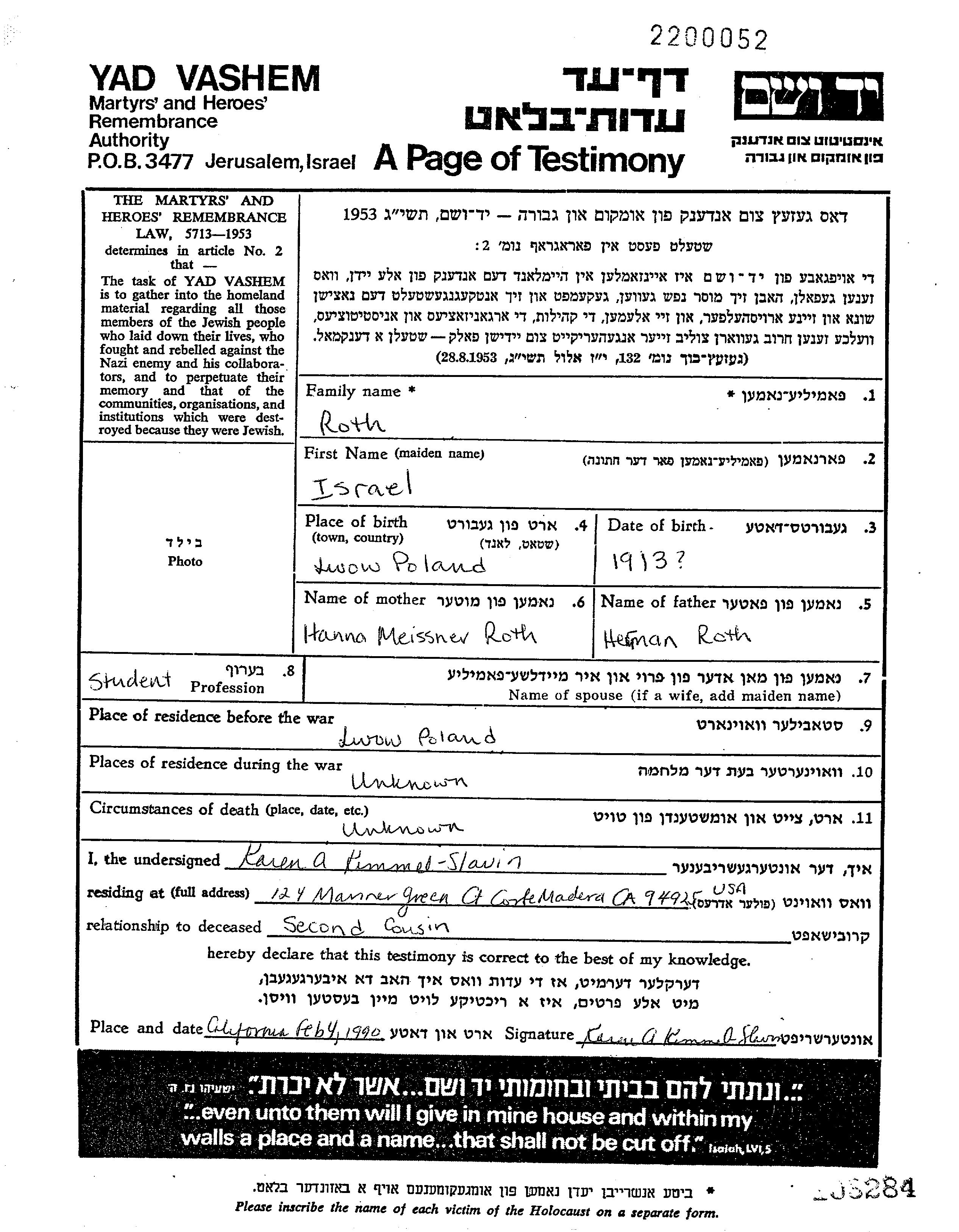 Israel Roth Rut wurde im Jahr 1913 in Lwow, Polen geboren. Er war der Sohn von Herman und Hanna, geb. Meissner. Er war Student. Vor dem Zweiten Weltkrieg lebte er in Lwow, Polen.