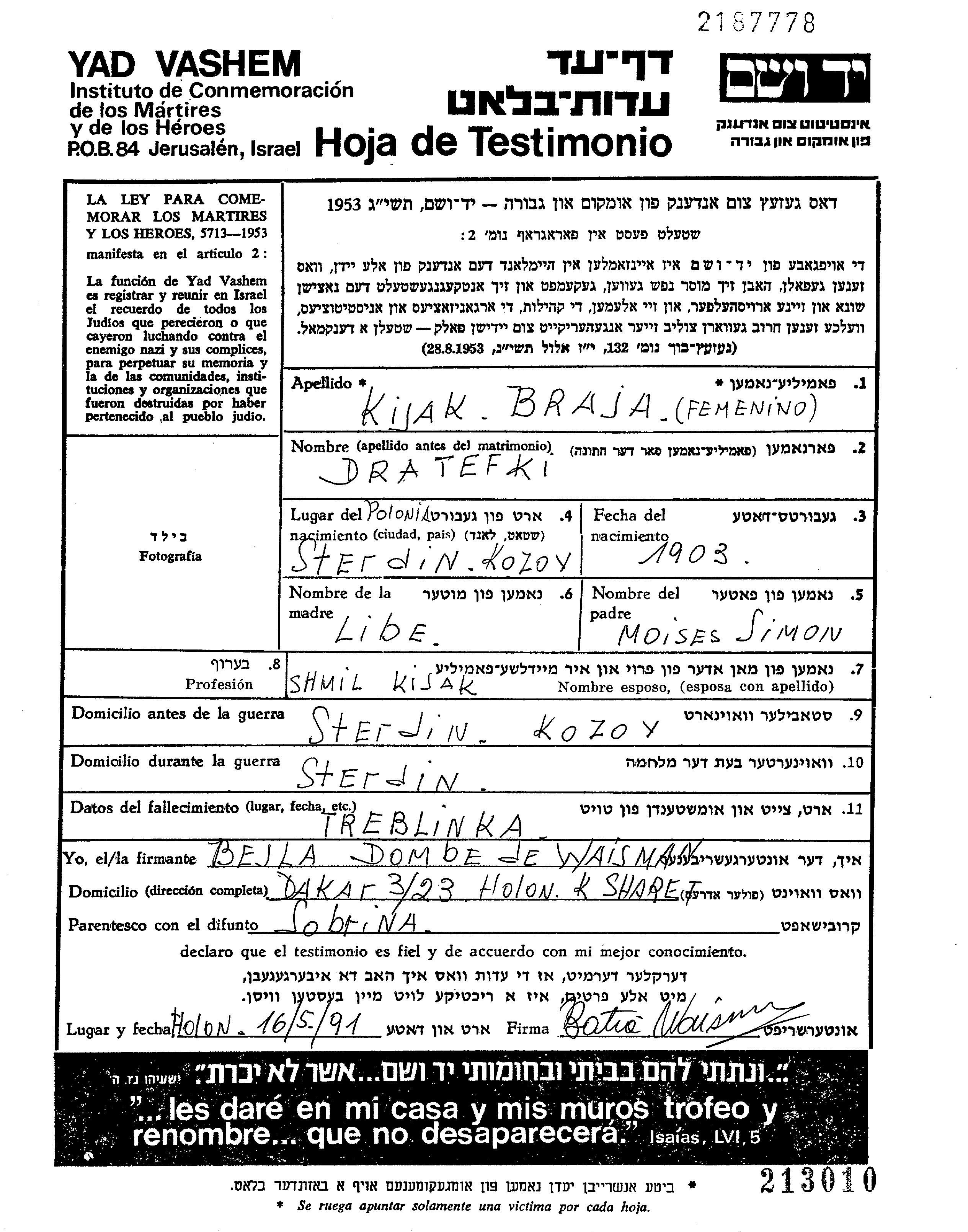 Braja Ber Kijak, geb. Dratefki wurde im Jahr 1903 in Sterdyn, Polen geboren. Sie war die Tochter von Moises Simon und Liba. Sie war mit Shmil Verheiratet. Vor dem Zweiten Weltkrieg lebte sie in Kozow, Polen. Während des Krieges war sie in Sterdyn, Polen.