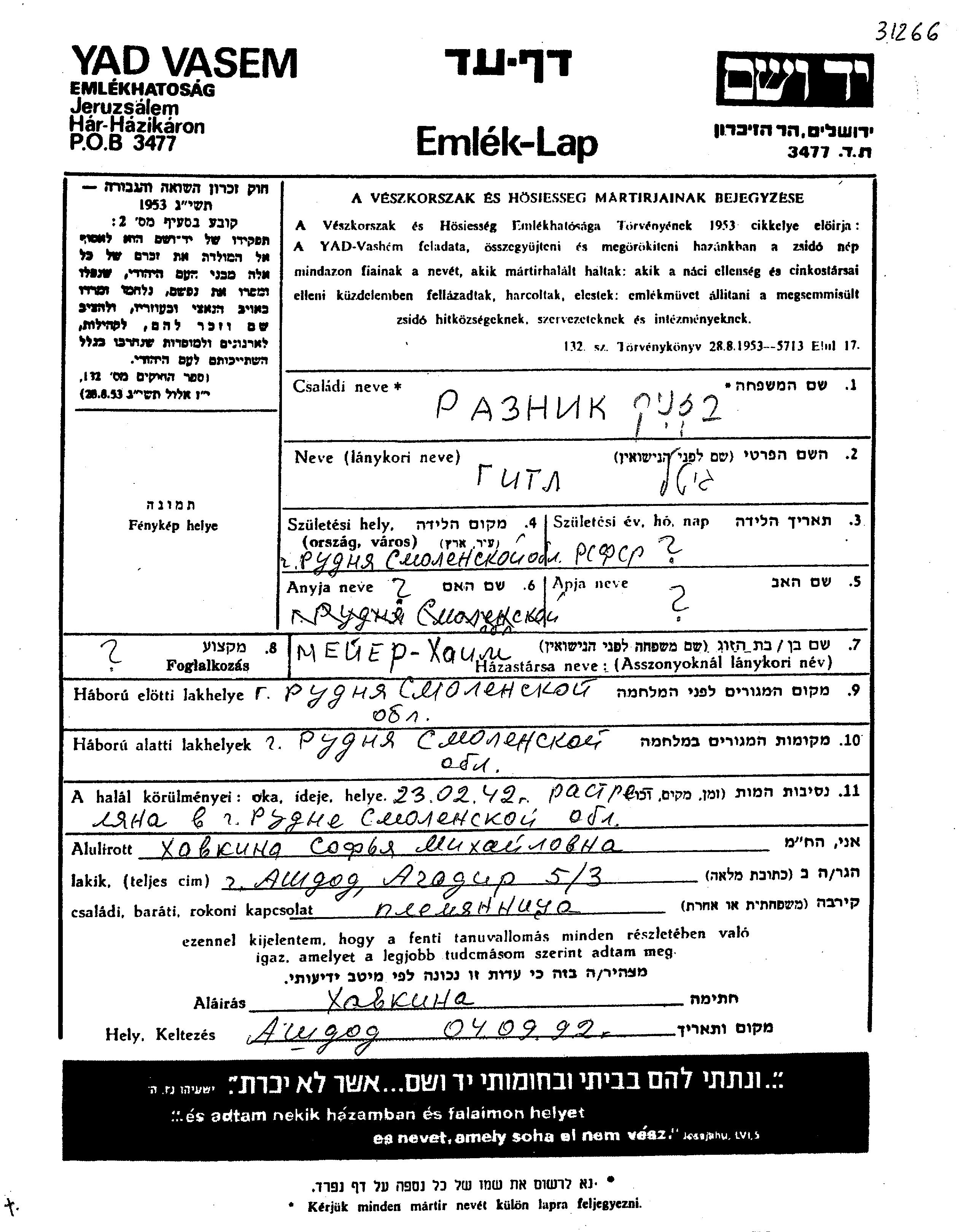 Raznik Gitl Rudnya, Russland (UdSSR) Gedenkblatt