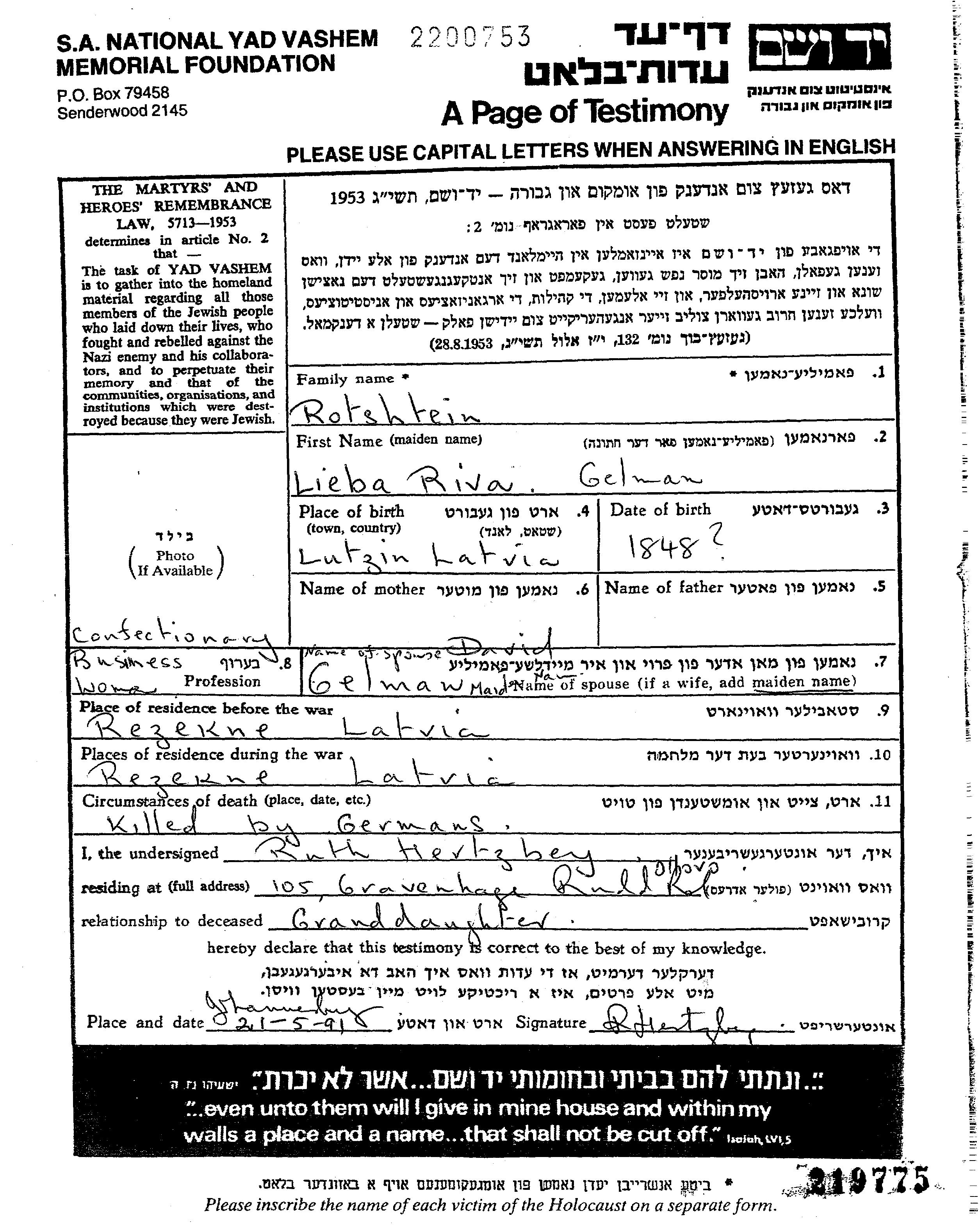 Lieba Riva Rotshtein, geb. Gelman wurde im Jahr 1848 in Lutsen, Lettland geboren. Sie war Geschäftsmann und mit David Verheiratet. Vor dem Zweiten Weltkrieg lebte sie in Rēzekne, Lettland. Während des Krieges war sie in Rēzekne, Lettland.