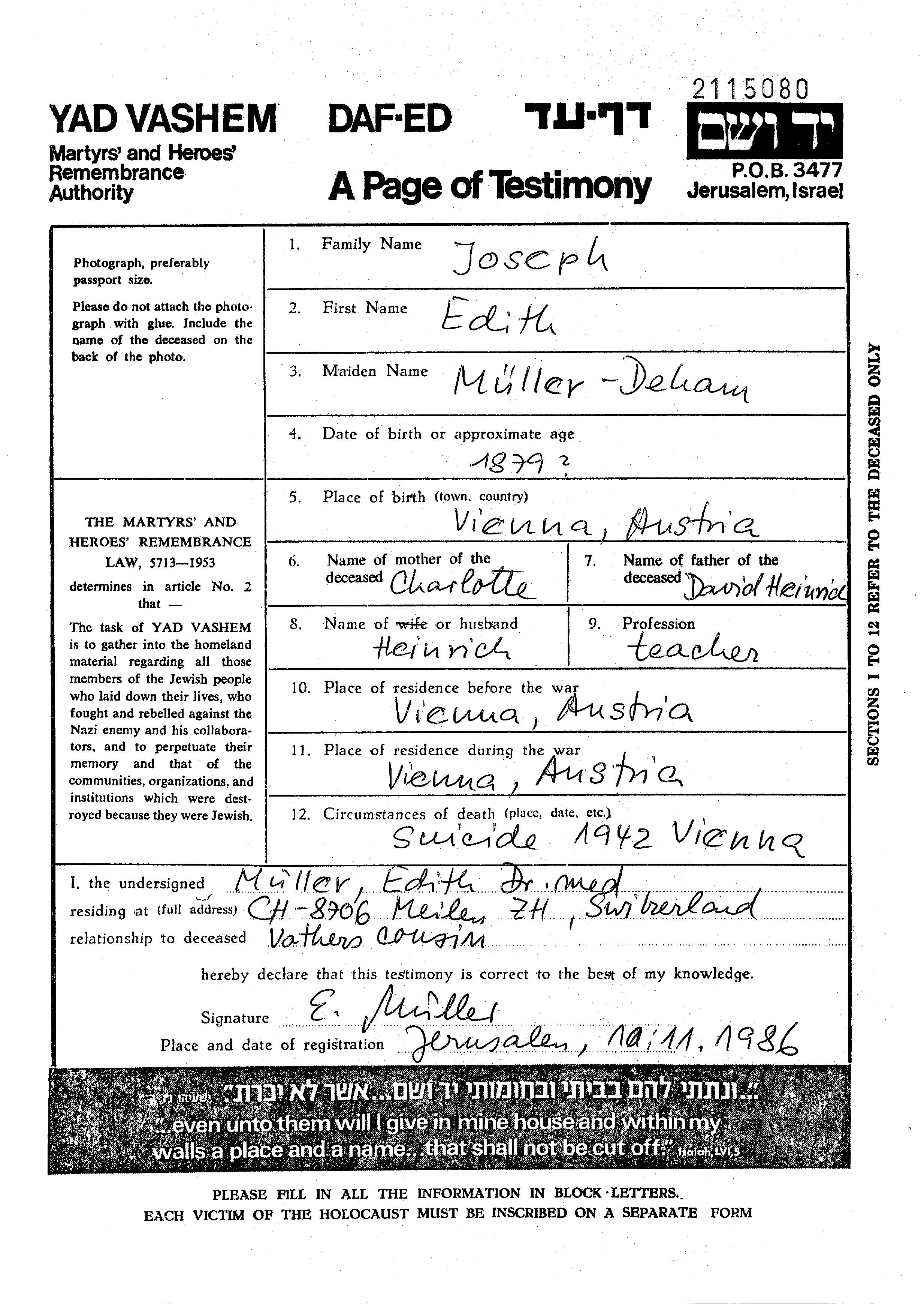 Edith Joseph, geb. Müller wurde im Jahr 1879 in Wien, Österreich geboren. Sie war die Tochter von David Heinrich und Charlotte. Sie war Lehrer/in und mit Heinrich Verheiratet. Vor dem Zweiten Weltkrieg lebte sie in Wien, Österreich. Während des Krieges war sie in Wien, Österreich.