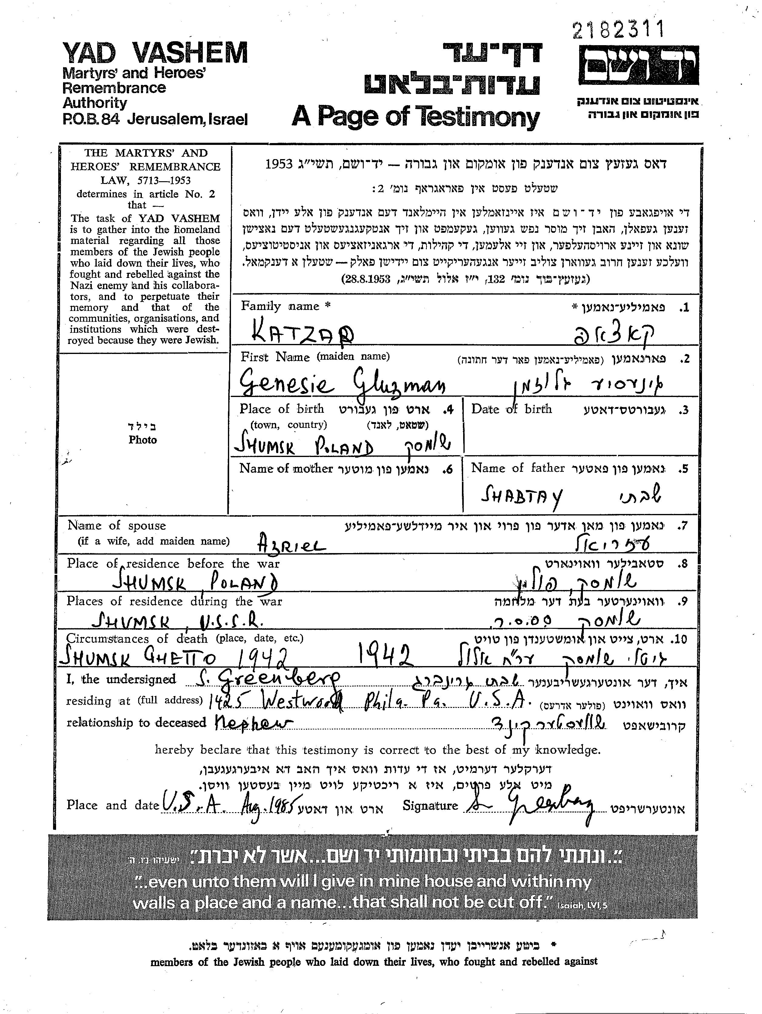 Genesie Katzap, geb. Gluzman wurde in Szumsk, Polen geboren. Sie war die Tochter von Shabtay. Sie war mit Azriel Verheiratet. Vor dem Zweiten Weltkrieg lebte sie in Szumsk, Polen. Während des Krieges war sie in Szumsk, Polen.