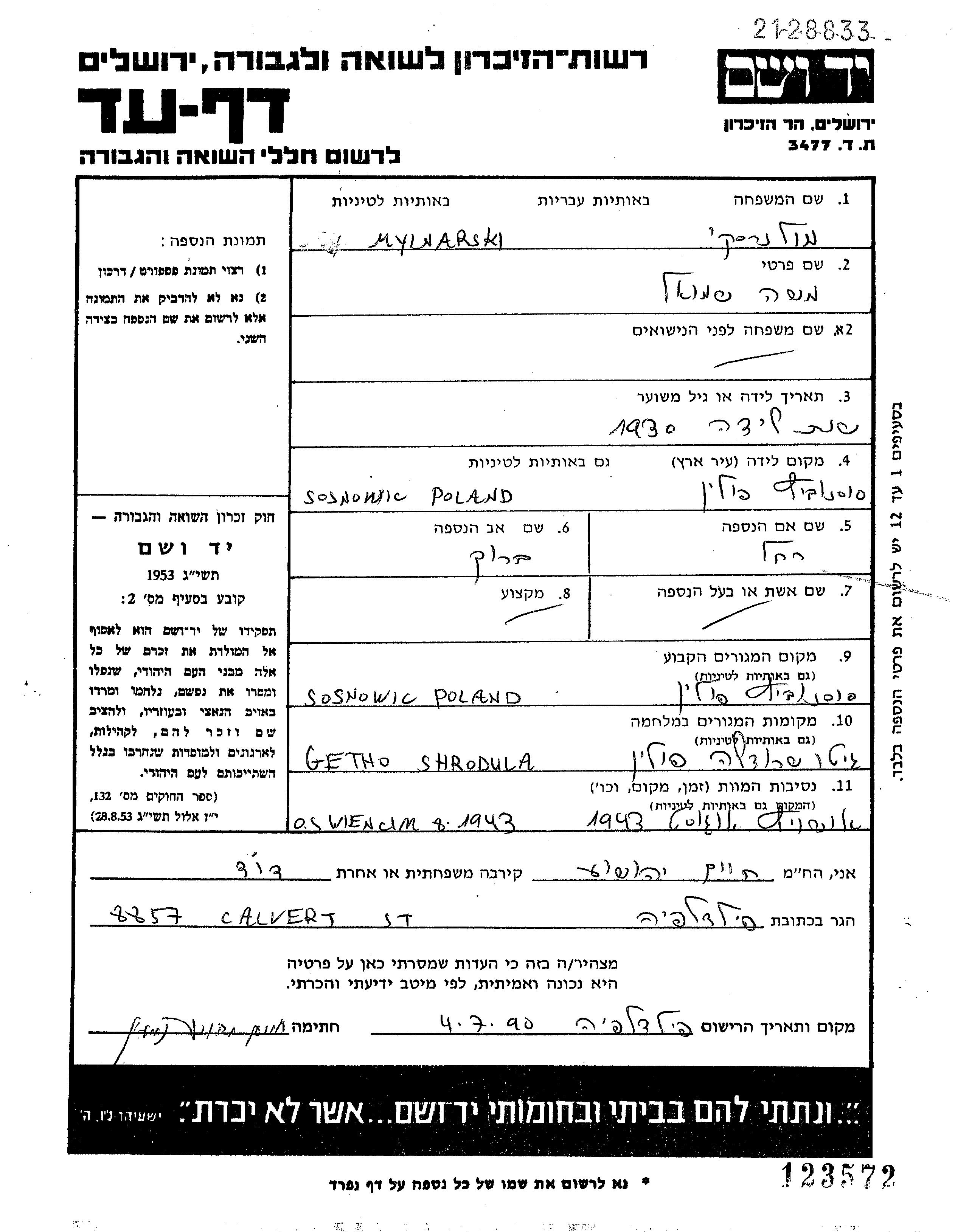 Mylnarski Moshe Shmuel 1930 Sosnowiec, Polen Gedenkblatt