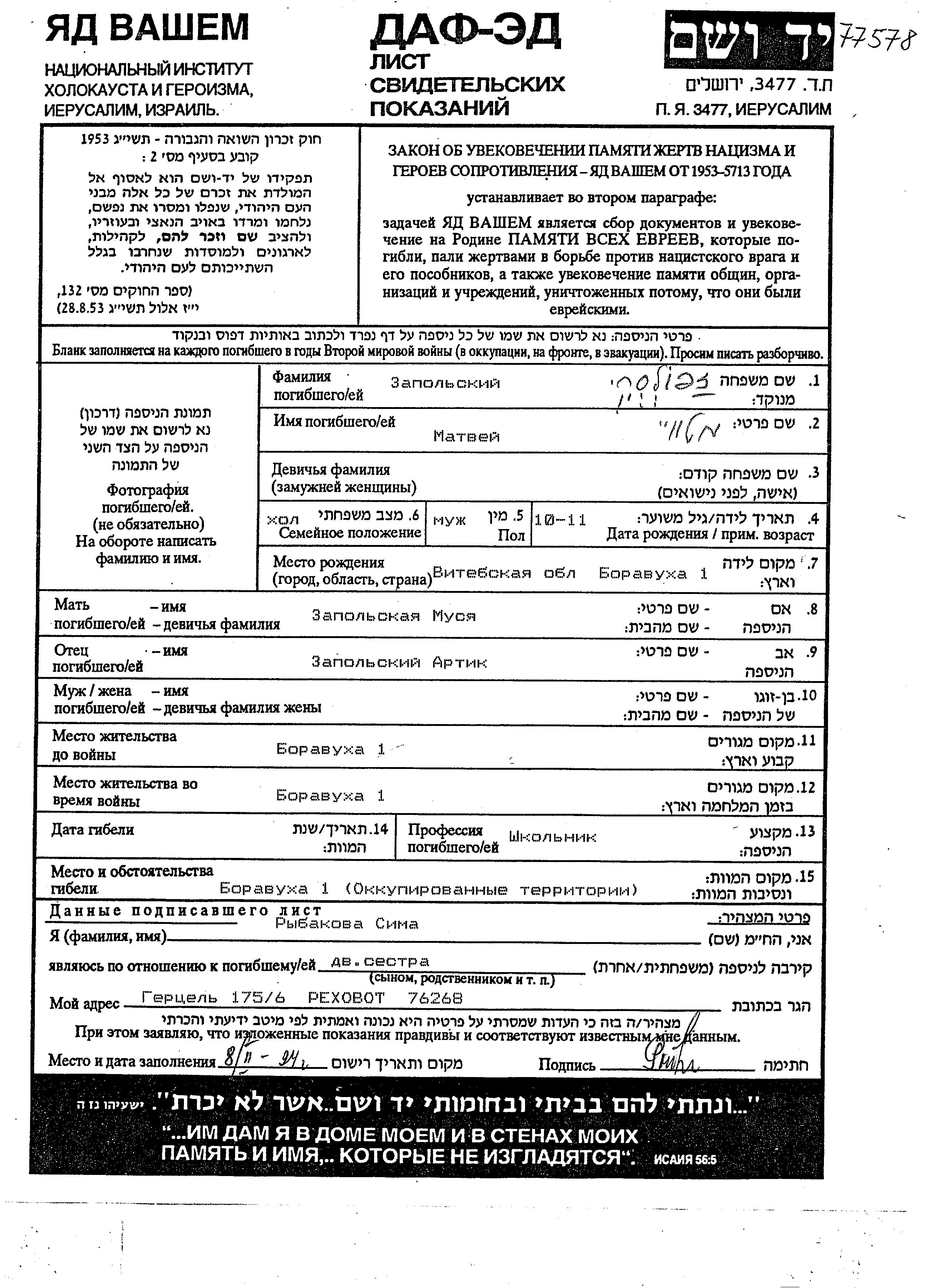 Matvei Zapolski wurde in Borovukha, Weißrussland (UdSSR) geboren. Er war der Sohn von Artur und Musia, geb. Rybakov. Er war Kind. Vor dem Zweiten Weltkrieg lebte er in Borovukha, Weißrussland (UdSSR). Während des Krieges war er in Borovukha, Weißrussland (UdSSR).