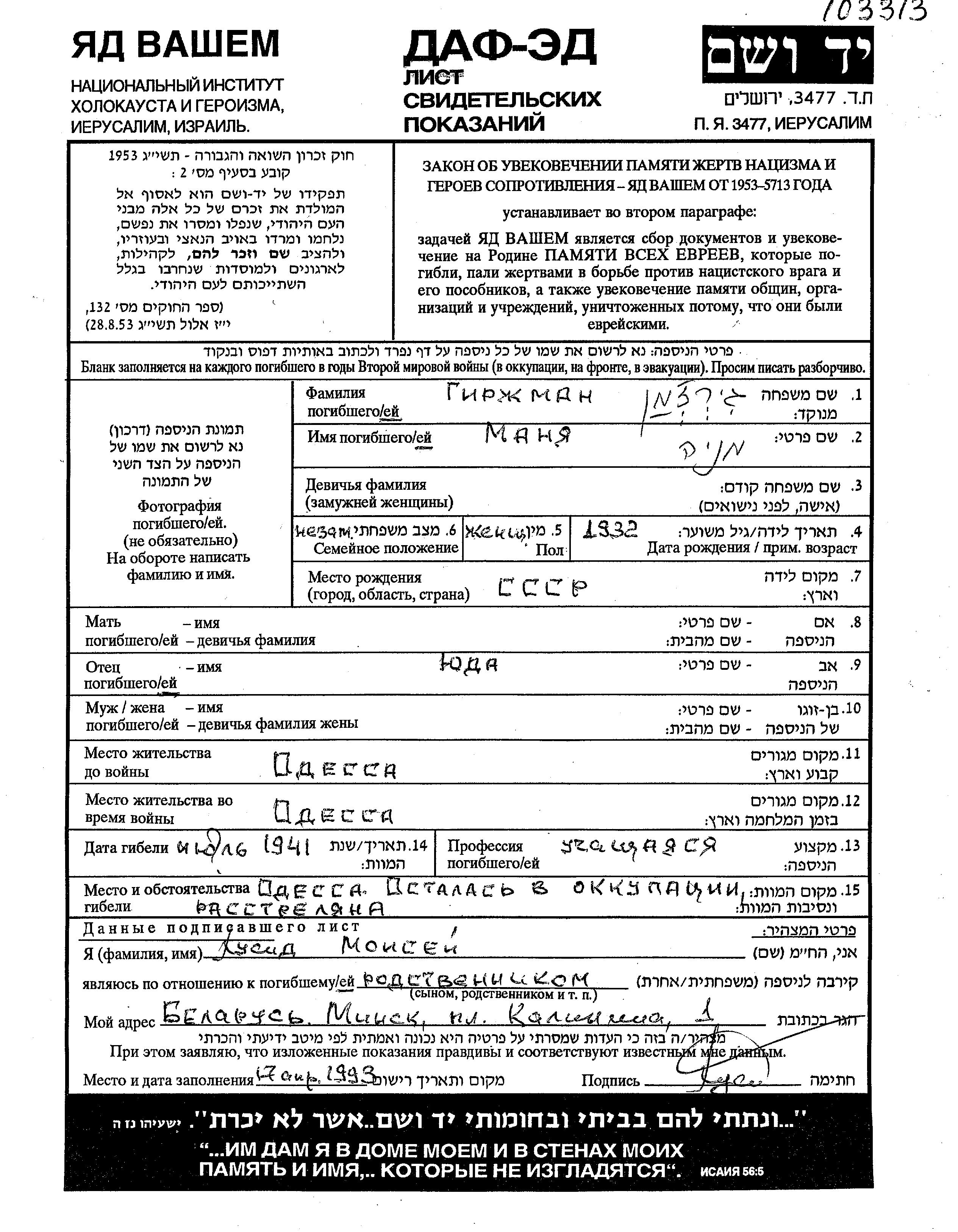 Mania Girzhman wurde im Jahr 1932 in Sowjetunion geboren. Sie war die Tochter von Yuda. Sie war Schüler/-in und Kind. Vor dem Zweiten Weltkrieg lebte sie in Odessa, Ukraine (UdSSR). Während des Krieges war sie in Odessa, Ukraine (UdSSR).