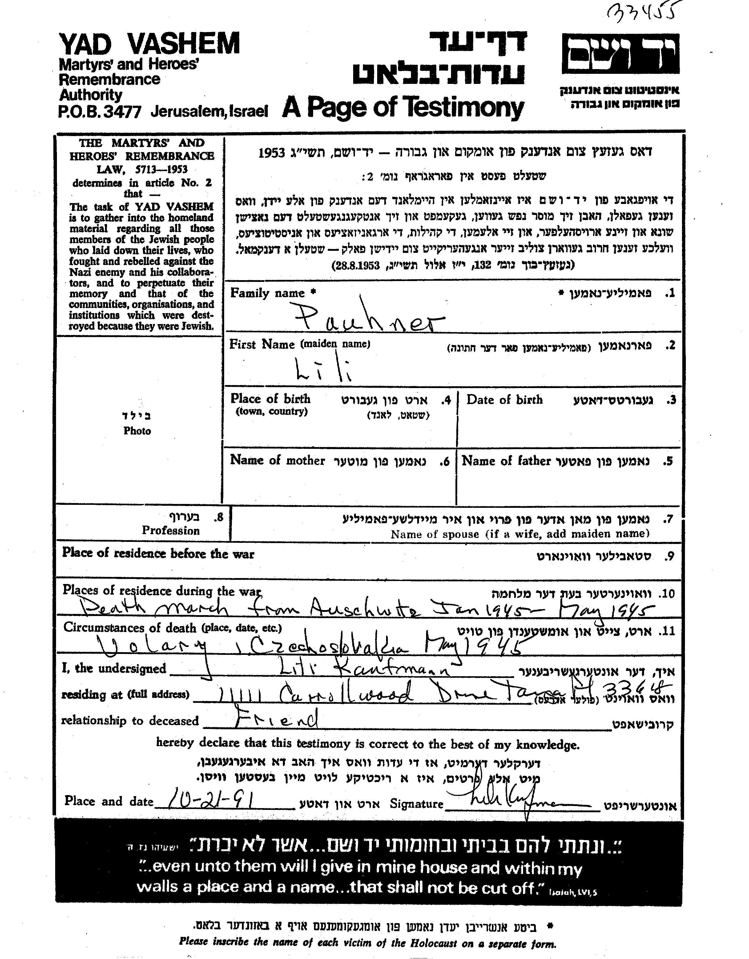 Lili wurde in der Schoah ermordet. Todesort: Volary, Tschechoslowakei im Jahr 1945.