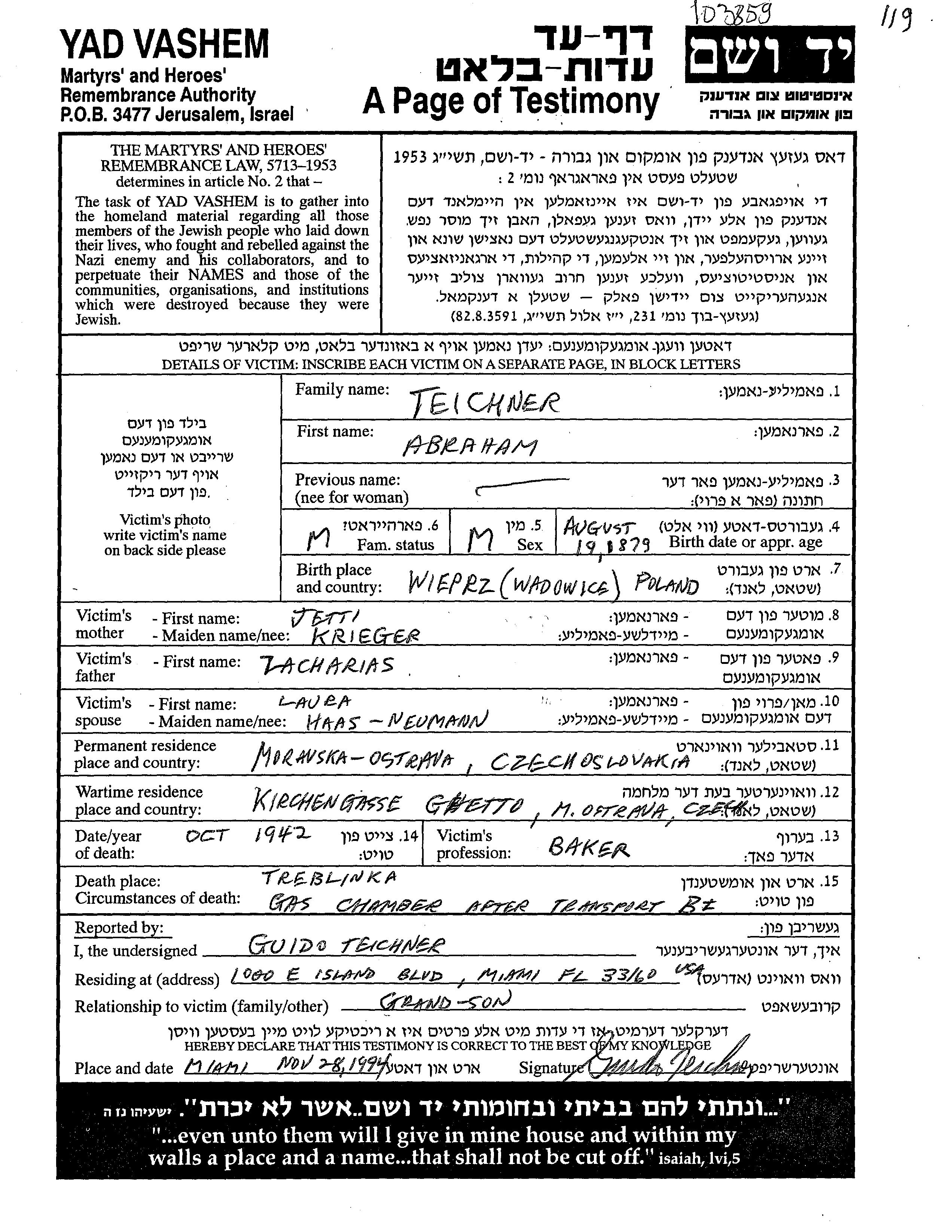 Abraham Teichner wurde im Jahr 1879 in Wadowice, Polen geboren. Er war der Sohn von Zacharias und Jetti, geb. Krieger. Er war Bäcker/-in und mit Laura Verheiratet. Vor dem Zweiten Weltkrieg lebte er in Moravska Ostrava, Tschechoslowakei. Während des Krieges war er in Moravska Ostrava, Tschechoslowakei.