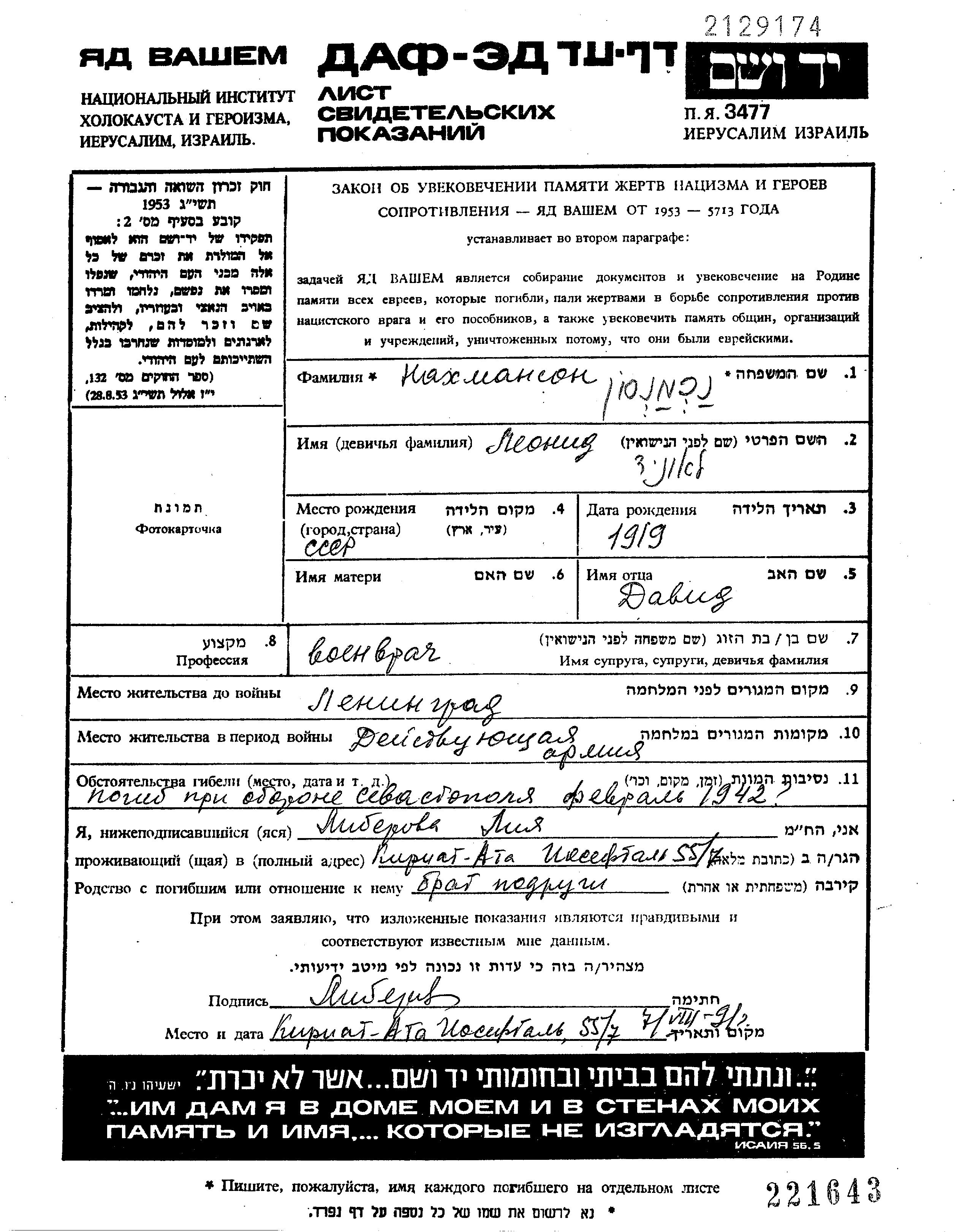 Leonid Nakhmanson wurde im Jahr 1919 in Sowjetunion geboren. Er war der Sohn von David. Er war Arzt/ärztin. Vor dem Zweiten Weltkrieg lebte er in Leningrad, Russland (UdSSR). Während des Krieges war er in die Sowjetischen Streitkräfte.