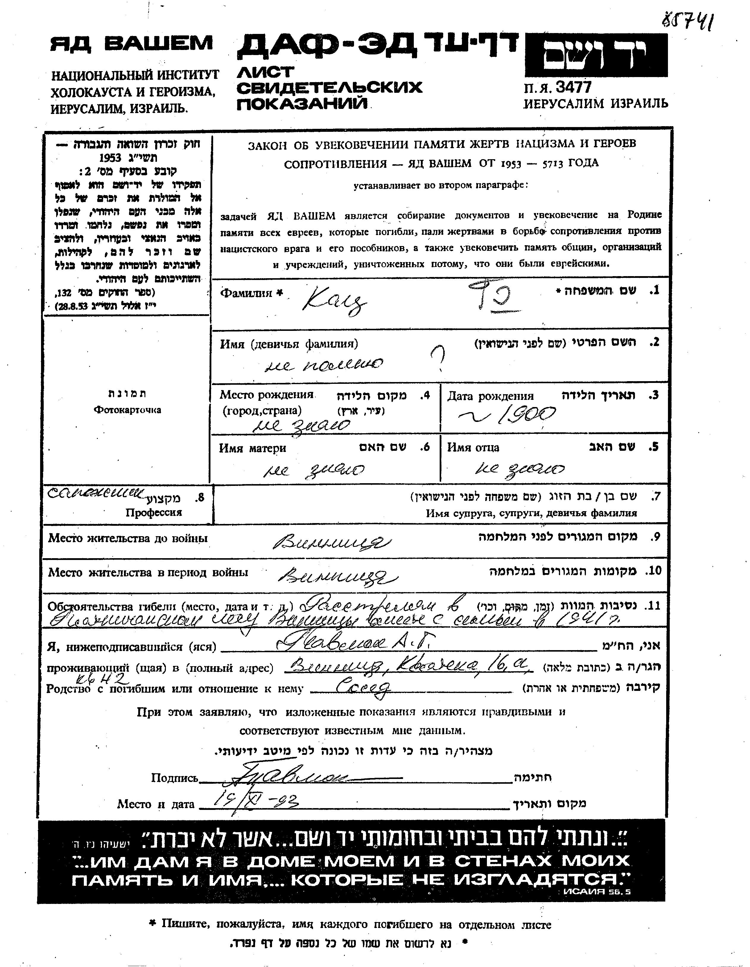 Vorname unbekannt Katz wurde im Jahr 1900 geboren. Er war Schuster/-in. Vor dem Zweiten Weltkrieg lebte er in Vinnitsa, Ukraine (UdSSR). Während des Krieges war er in Vinnitsa, Ukraine (UdSSR).