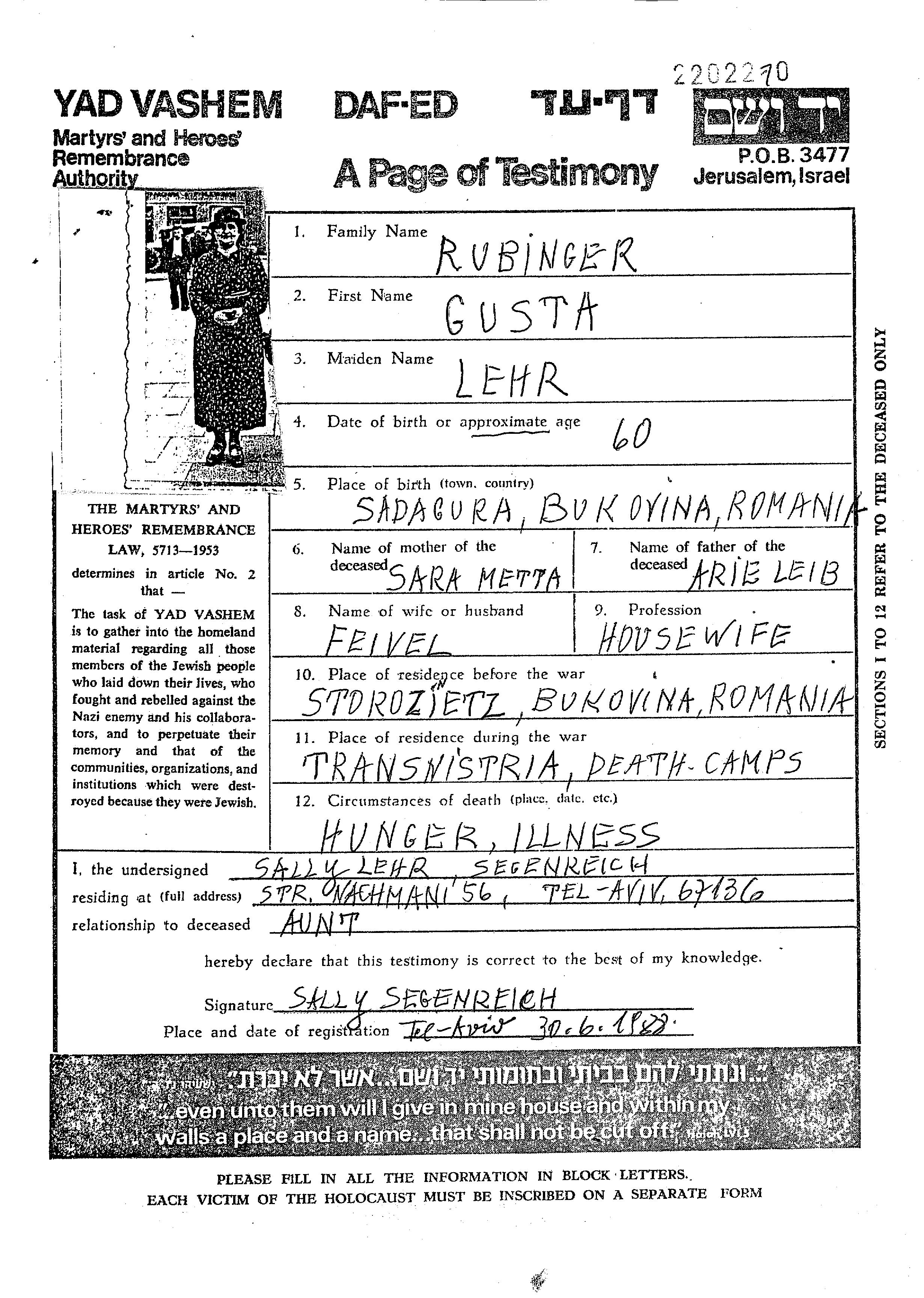 Gusta Rubinger, geb. Lehr wurde in Sadagura, Rumänien geboren. Sie war die Tochter von Arie Leib und Metta Sara Mate. Sie war Hausfrau und mit Faivel Verheiratet. Vor dem Zweiten Weltkrieg lebte sie in Storojineti, Rumänien. Während des Krieges war sie in Transnistria, Ukraine (UdSSR).
