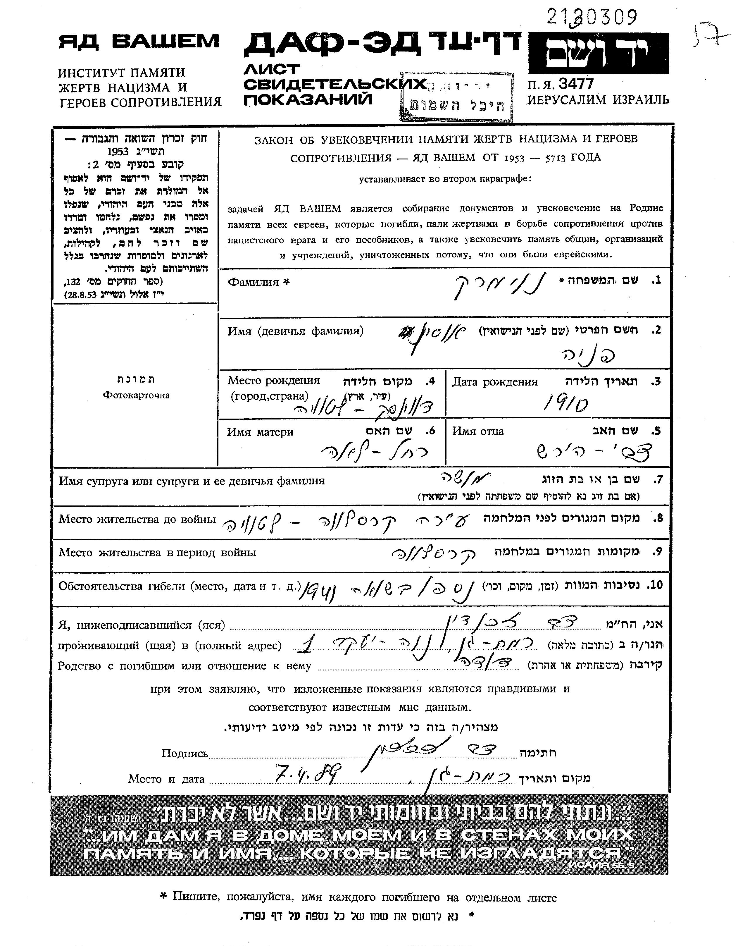 Fania Neumark, geb. Osin wurde im Jahr 1910 in Dvinsk, Lettland geboren. Sie war die Tochter von Tzvi Hirsh und Rakhel Lea. Sie war mit Moshe Verheiratet. Vor dem Zweiten Weltkrieg lebte sie in Karsava, Lettland. Während des Krieges war sie in Karsava, Lettland.