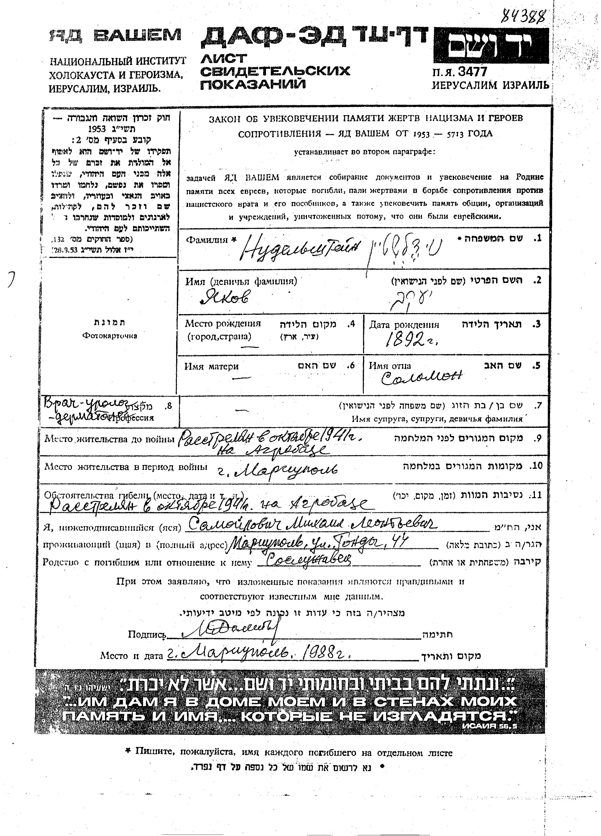 Yakov Nudelshtein wurde im Jahr 1892 geboren. Er war der Sohn von Solomon. Er war Arzt/ärztin. Während des Krieges war er in Mariupol, Ukraine (UdSSR).
