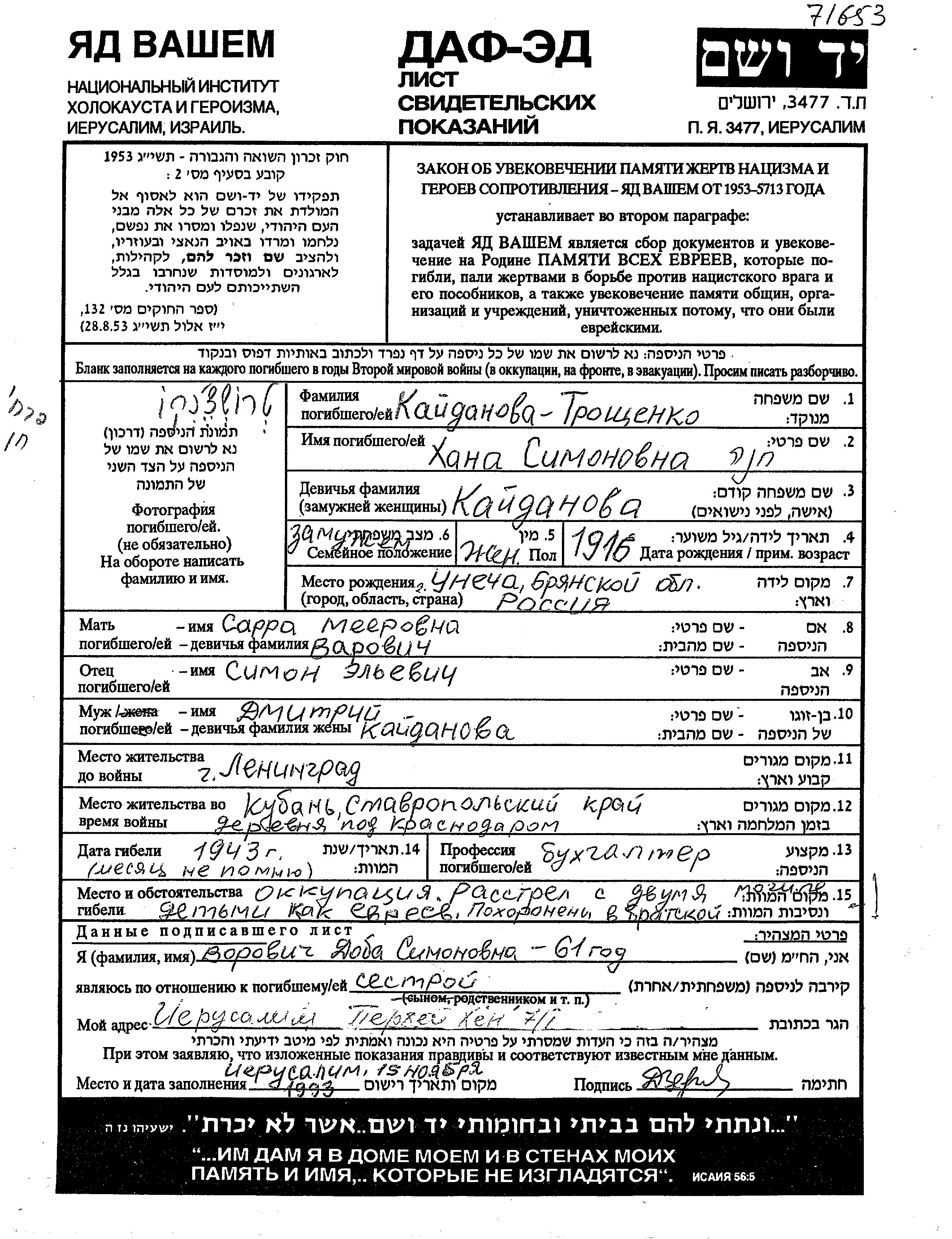 Khana Troshchenko, geb. Kaidanov wurde im Jahr 1916 in Unecha, Russland (UdSSR) geboren. Sie war die Tochter von Simon und Sara, geb. Varovich. Sie war Buchhalter/-in und mit Dmitri Verheiratet. Vor dem Zweiten Weltkrieg lebte sie in Leningrad, Russland (UdSSR). Während des Krieges war sie in Krasnodar, Russland (UdSSR).