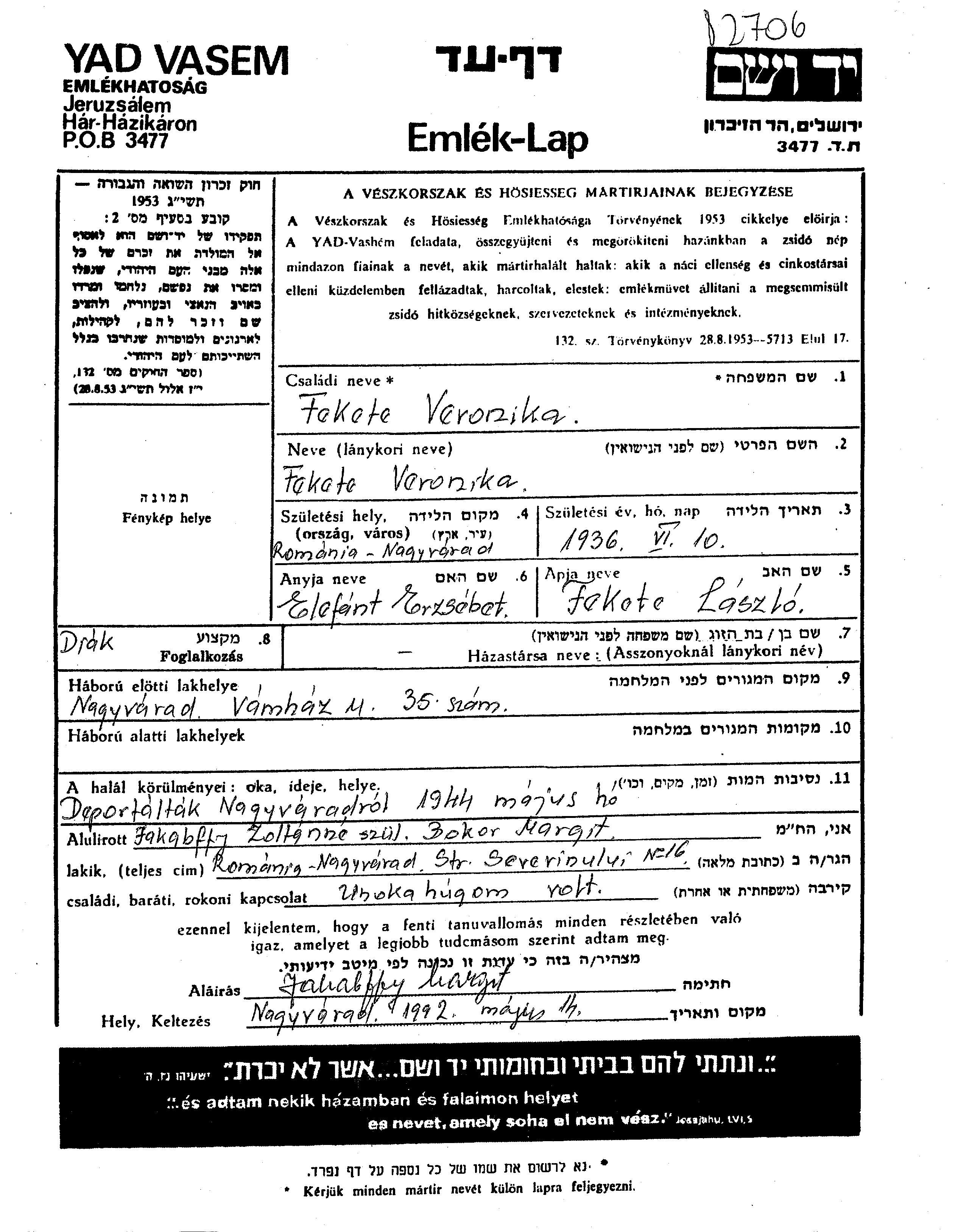 Veronika Fekete wurde im Jahr 1936 in Nagyvarad, Rumänien geboren. Sie war die Tochter von Laszlo und Erzsebet, geb. Elefant. Sie war Schüler/-in und Kind. Vor dem Zweiten Weltkrieg lebte sie in Nagyvarad, Rumänien. Während des Krieges war sie in Nagyvarad, Rumänien.