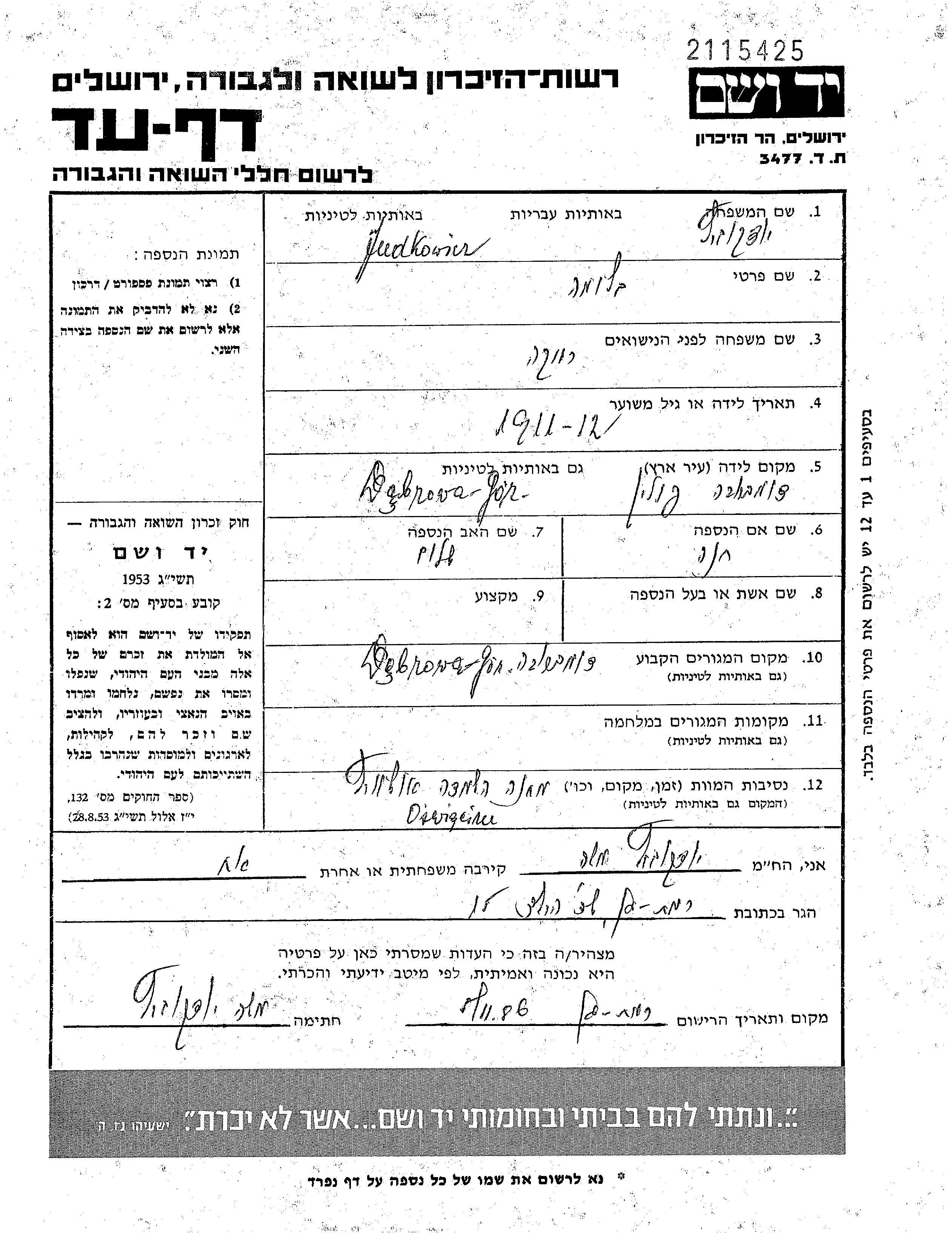 Bluma Judkowicz wurde in Dabrowa Gornicza, Polen geboren. Sie war die Tochter von Shalom und Khana, geb. Federman. Sie war Ledig. Vor dem Zweiten Weltkrieg lebte sie in Dabrowa Gornicza, Polen.