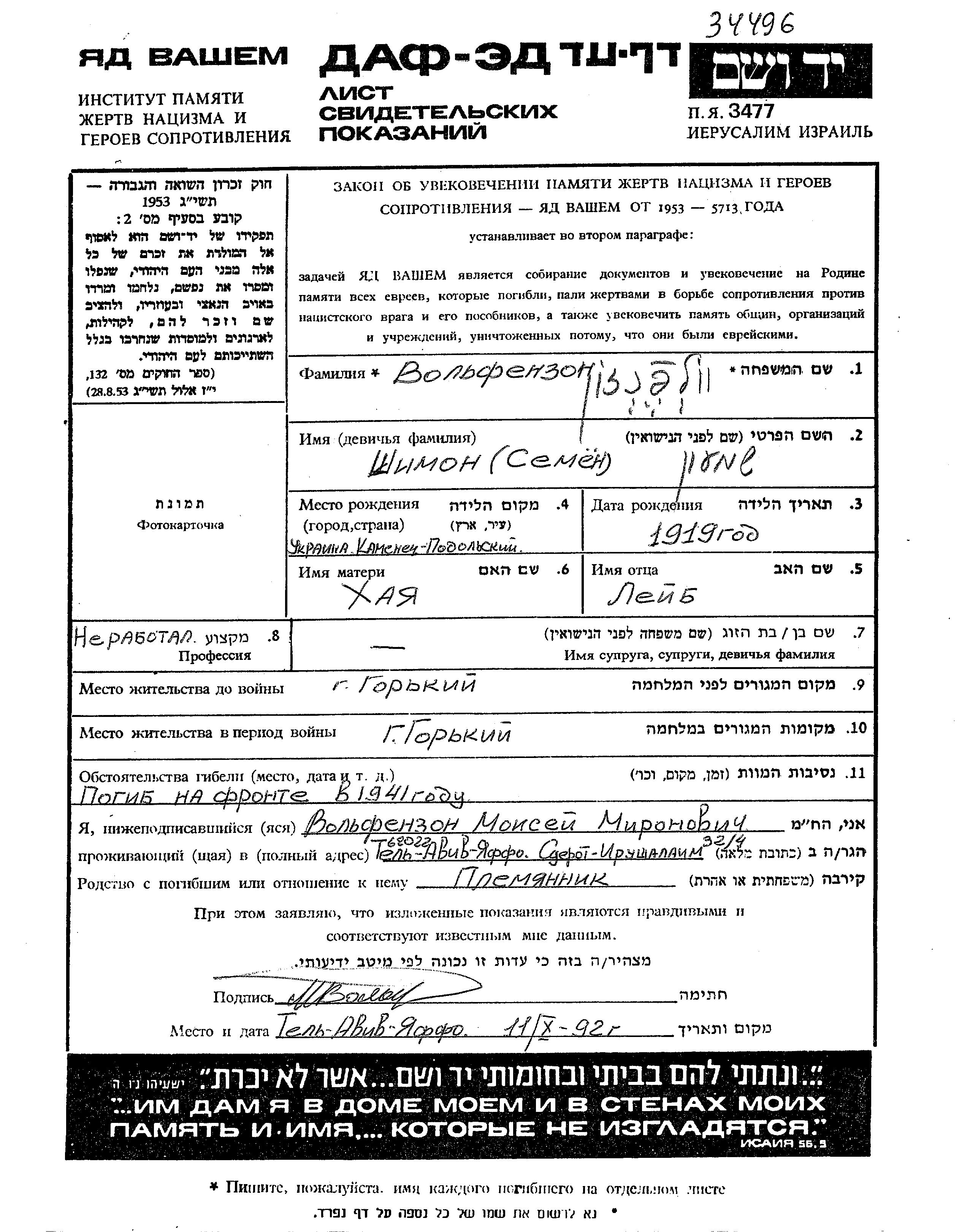 Shimon Volfenzon wurde im Jahr 1919 in Kamenets Podolskiy, Ukraine (UdSSR) geboren. Er war der Sohn von Leib und Khaia. Vor dem Zweiten Weltkrieg lebte er in Gorkiy, Russland (UdSSR). Während des Krieges war er in die Sowjetischen Streitkräfte.