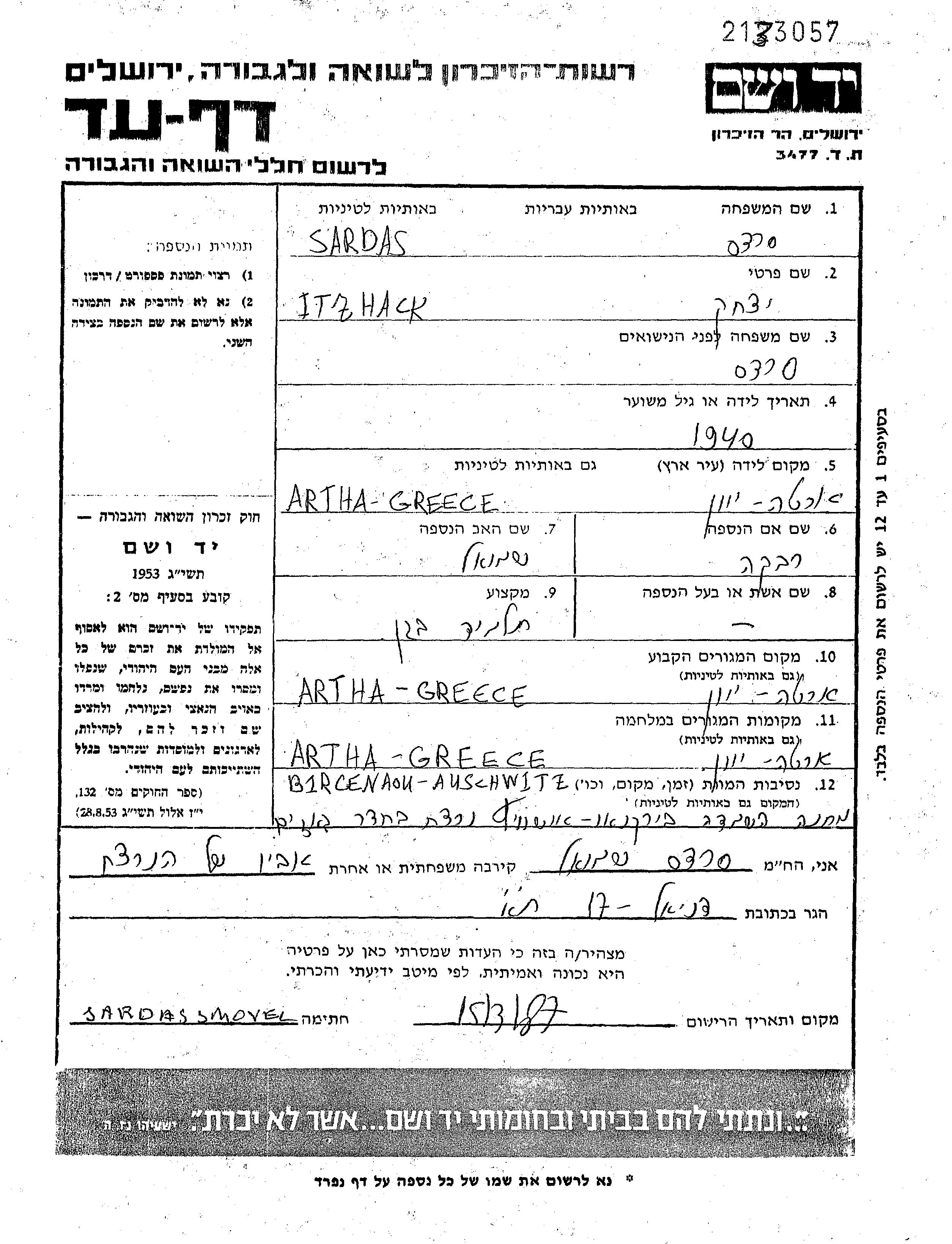 Itzhack Sardas wurde in Arta, Griechenland geboren. Er war der Sohn von Shmuel und Rebecaa, geb. Shalom. Er war Schüler/-in und Kind. Vor dem Zweiten Weltkrieg lebte er in Arta, Griechenland. Während des Krieges war er in Arta, Griechenland.